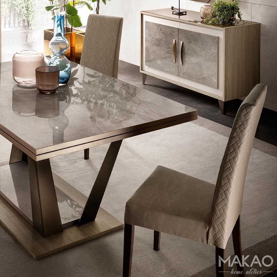 Bufet, ze swoją zasadniczą i wyrafinowaną konstrukcją, dobrze komponuje się z resztą mebli, przyjmując neutralne kolory i oferując po raz kolejny lakierowany szklany blat i satynowane uchwyty z brązu. Mebel, który mówi o funkcjonalności i estetyce, oferujący zarówno miejsce do przechowywania zastawy stołowej, jak i detale, które nadają pomieszczeniu poczucie spójności