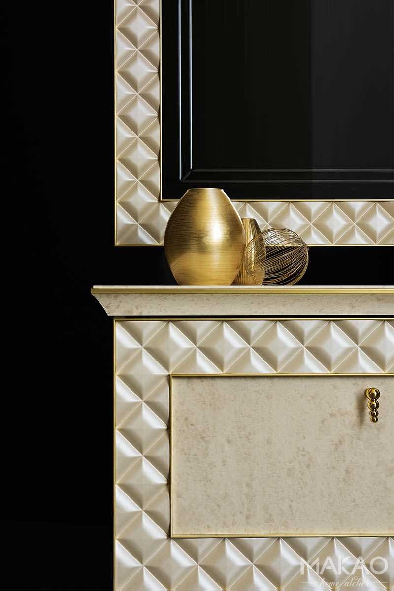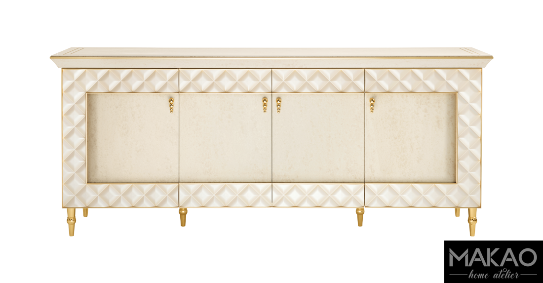 Bufet z kolekcji Fabbri wyróżnia się minimalistyczną i dopracowaną geometrią. Forma równoległościanu jest ozdobiona świetlistymi detalami, a całość jest otoczona ramą projektu capitonné, która nawiązuje do form całej kolekcji. Pozłacane stopy, których geometria podnosi objętość, nadają jednocześnie lekkości i rozmachu.