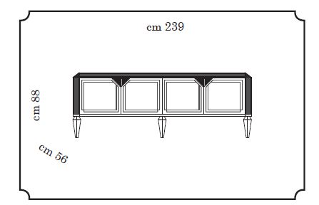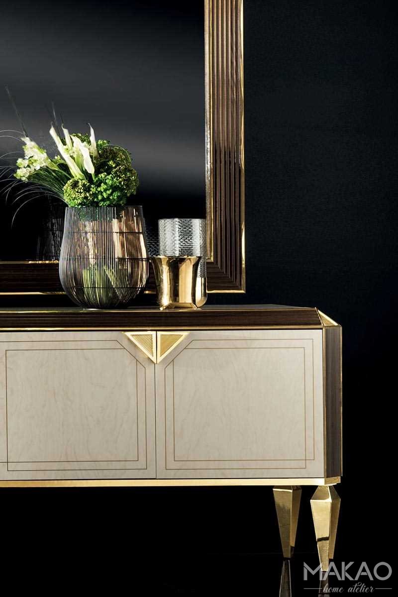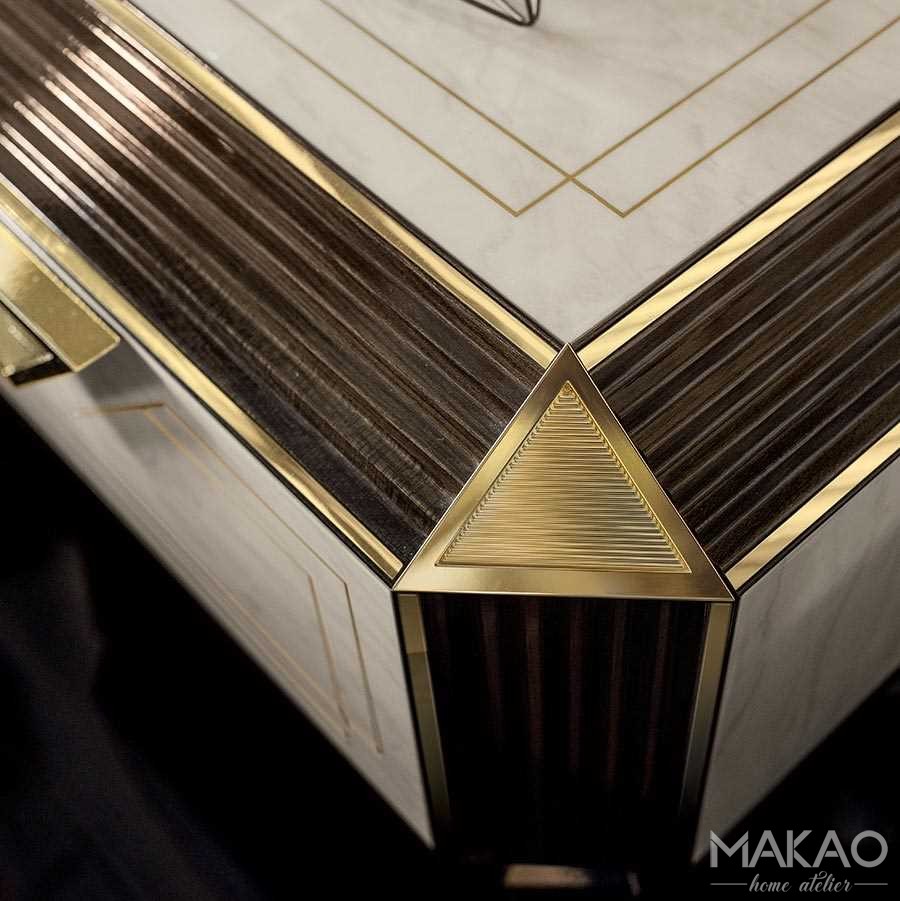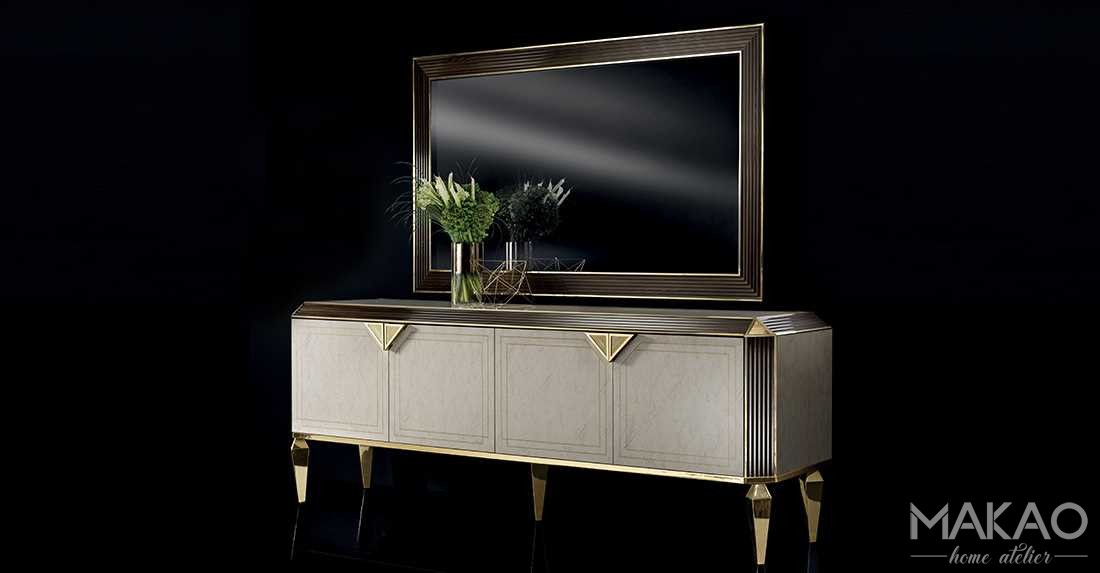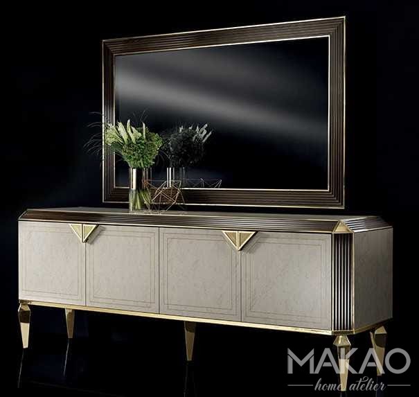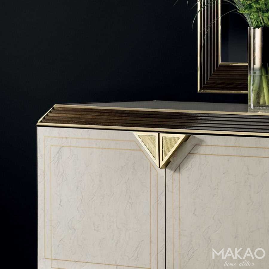 Bufet Belleza to bryła która nie traci wyczucia proporcji i miary pomimo dużych rozmiarów. Mebel ustawiony jest na nogach w złotym kolorze TECRES, które nie tylko wspierają bufet, ale także podkreślają jego swoisty projekt. Trójkątne uchwyty razem ze złotym nadrukiem ukazują styl kolekcji Bellezza.