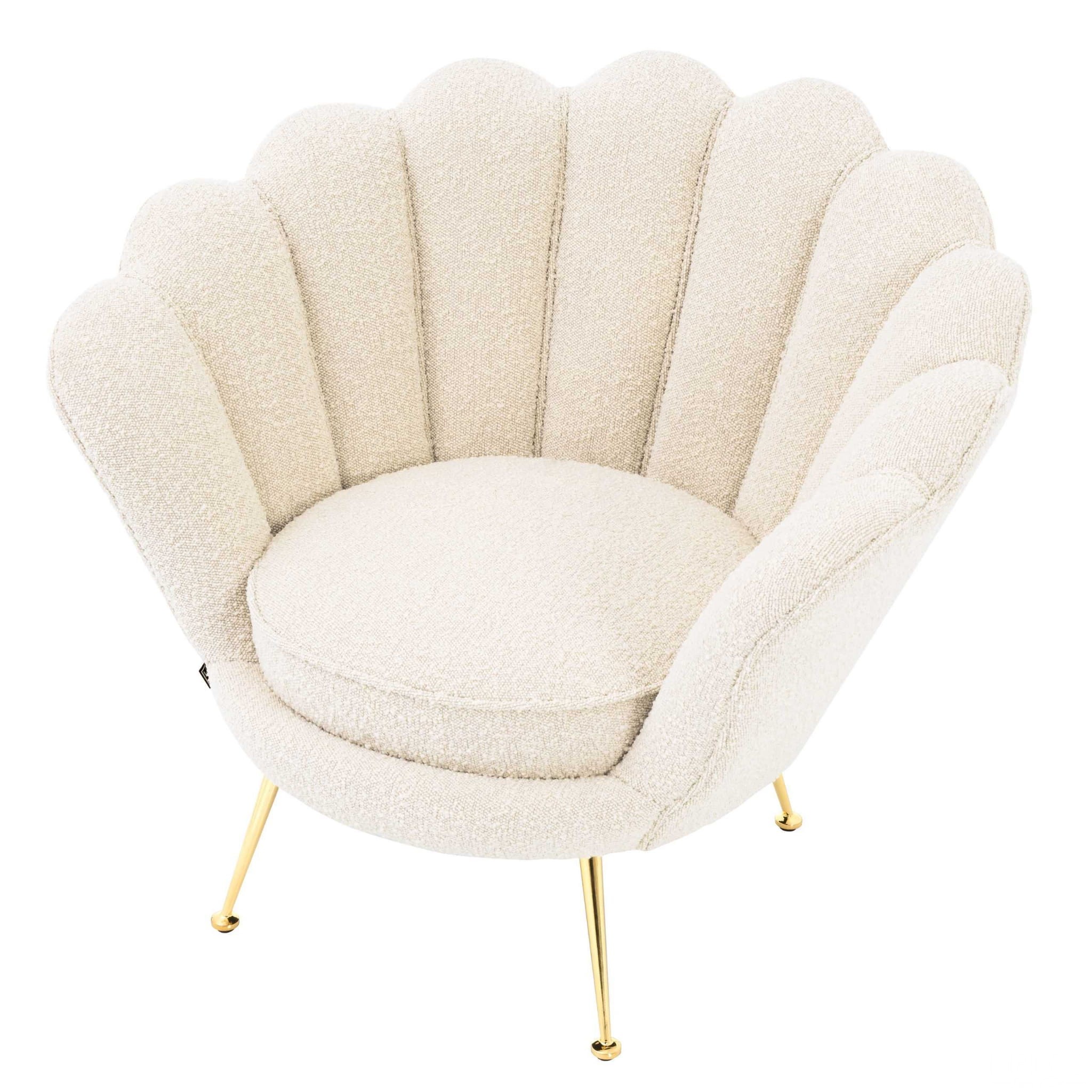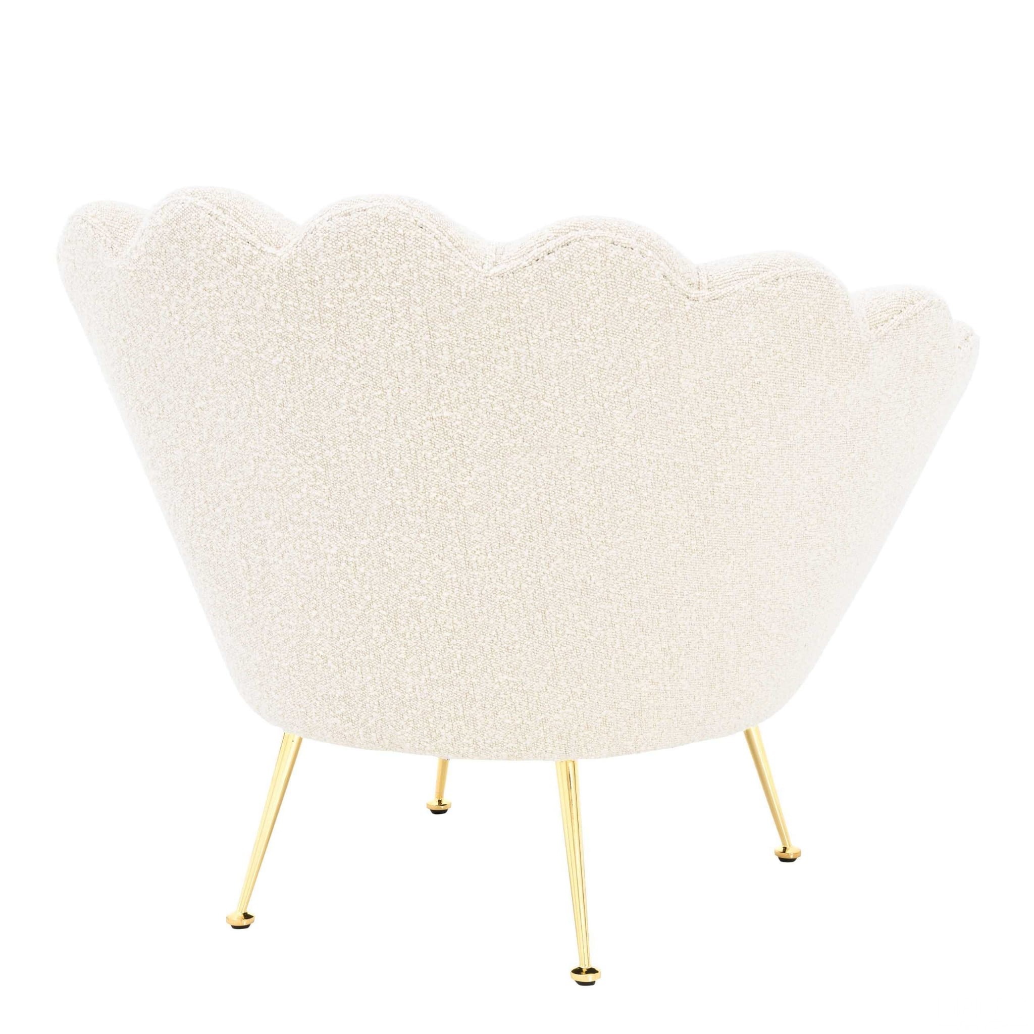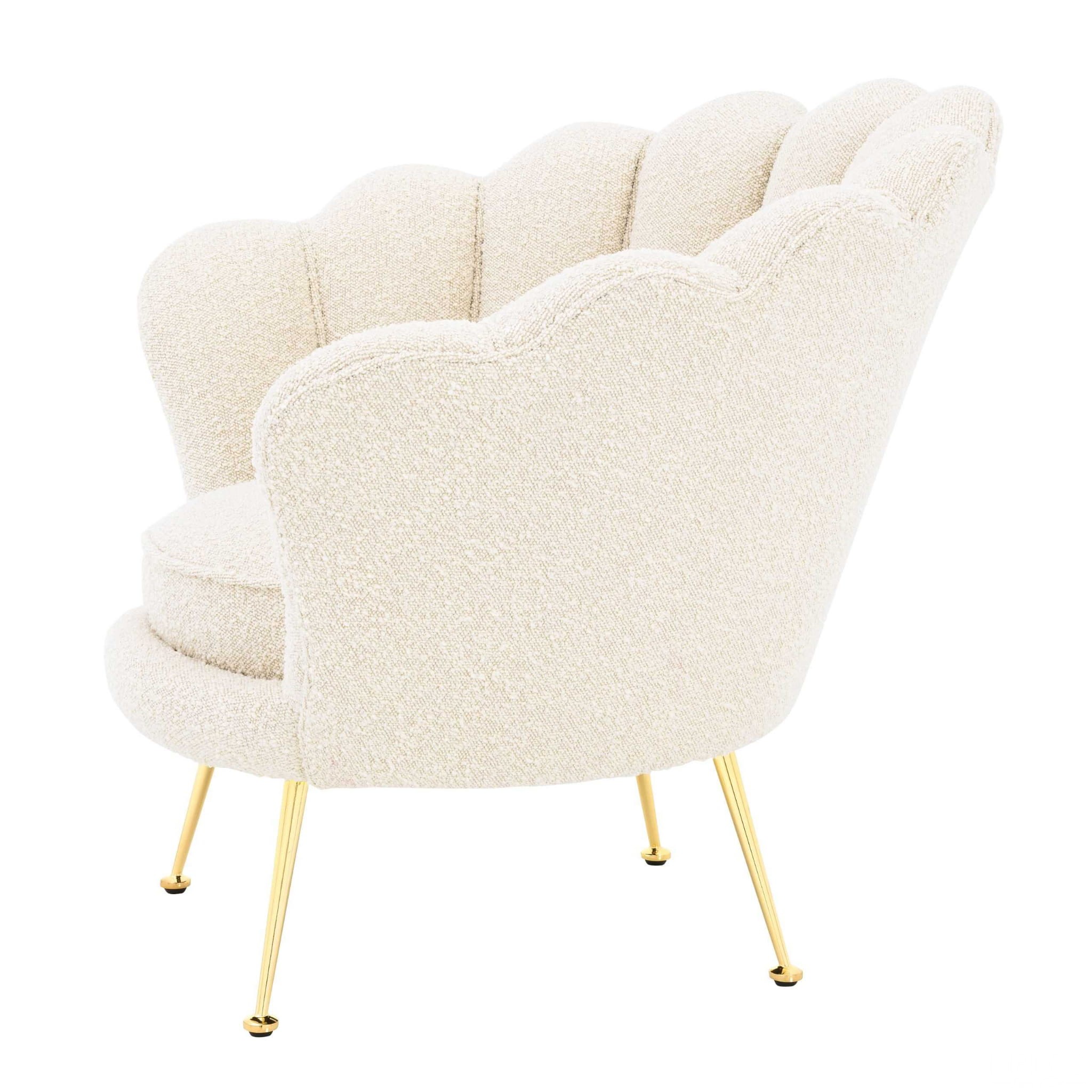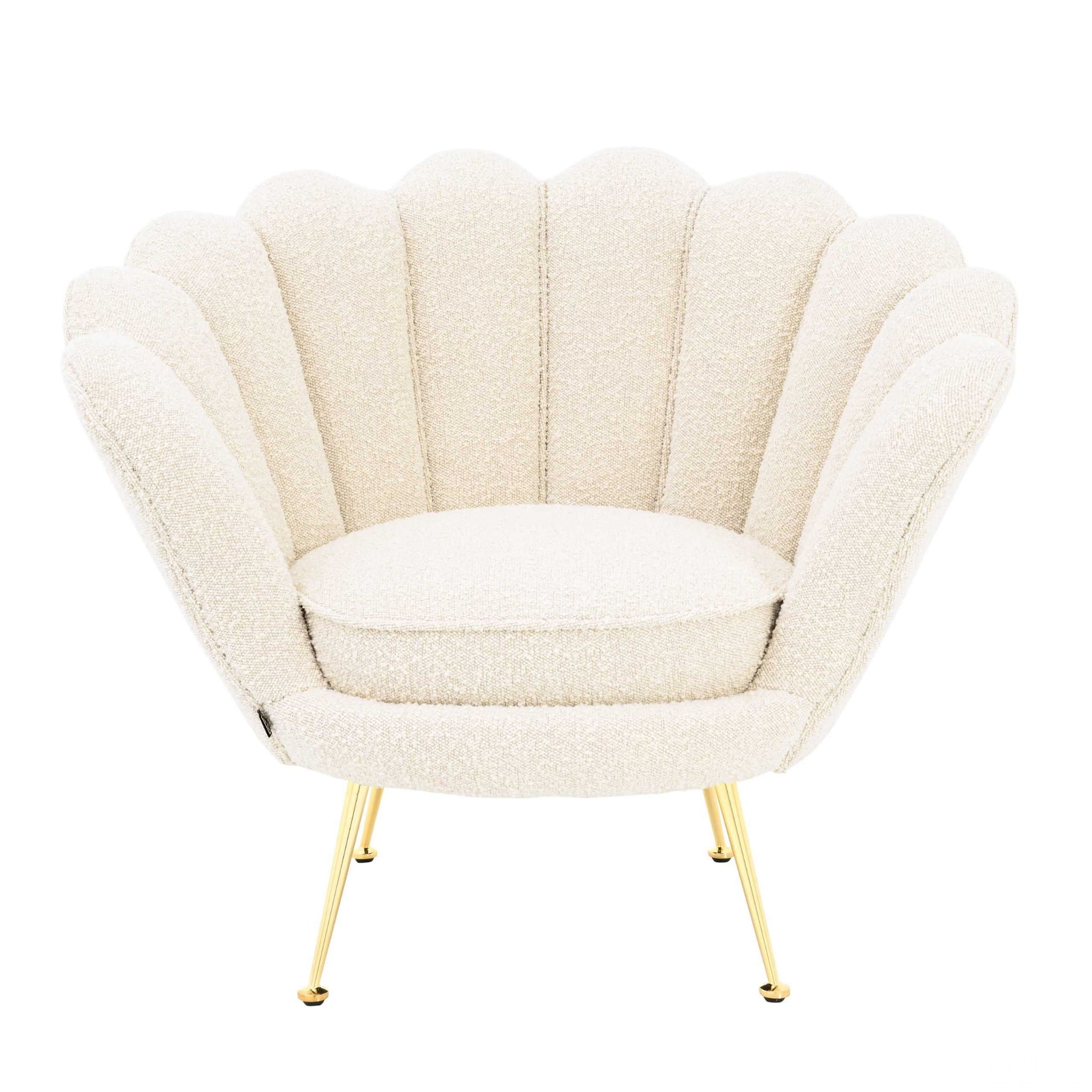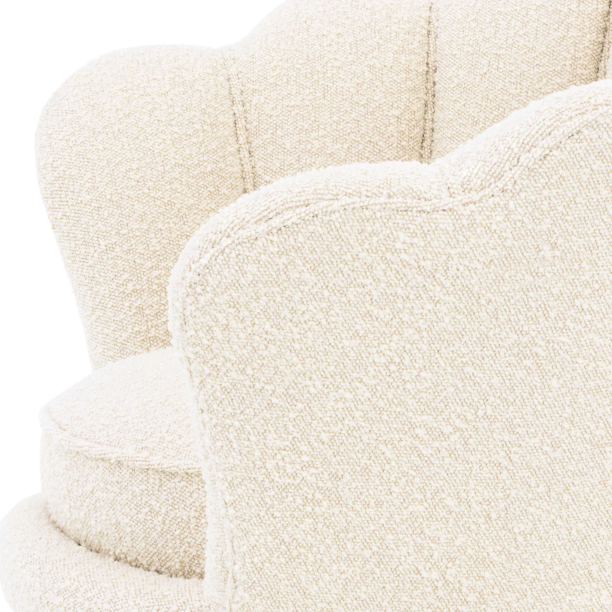 Zrelaksuj się w krześle trapezowym inspirowanym Art Deco, które z pewnością nada Twojemu wnętrzu efekt zachwytu. Dzięki ramie w kształcie muszli, w kremowej tapicerce i zwężającym się mosiężnym nogom to wspaniałe siedzisko emanuje klasycznym urokiem.