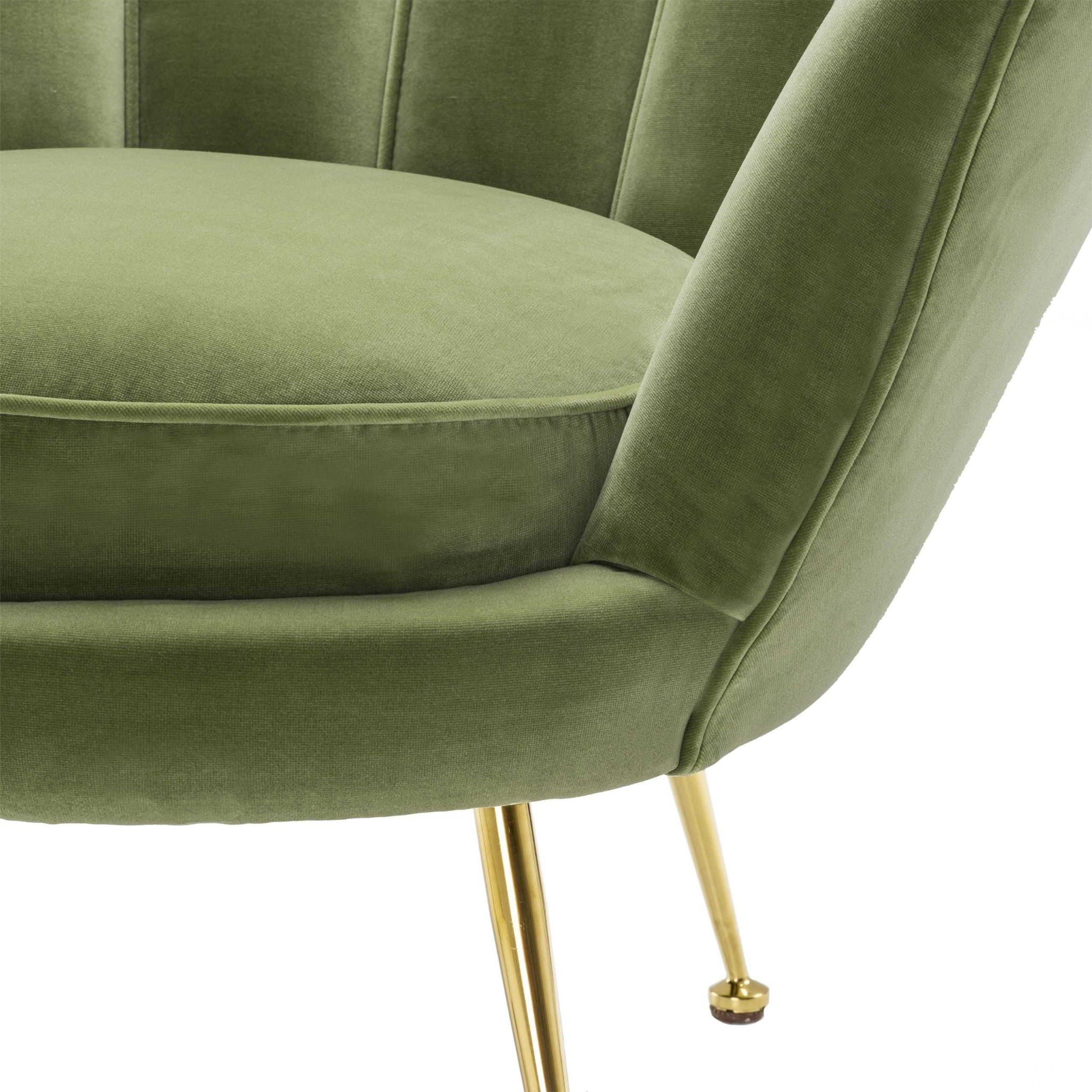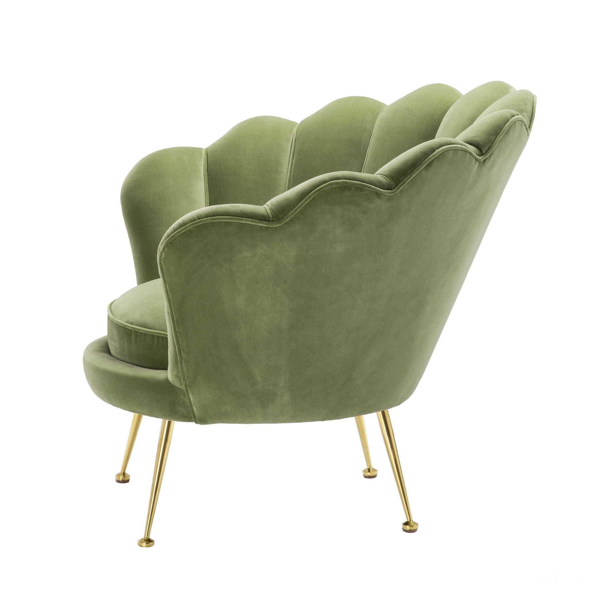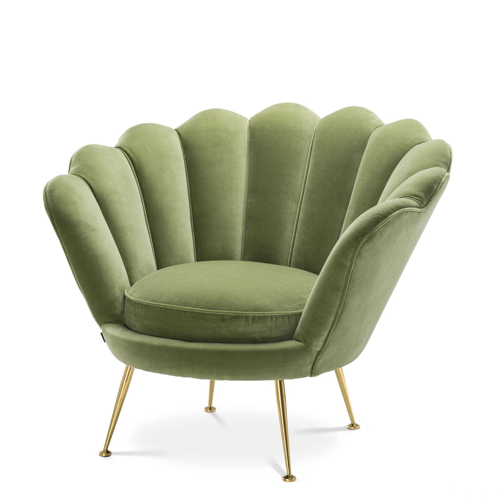 Zrelaksuj się w krześle trapezowym inspirowanym Art Deco, które z pewnością nada Twojemu wnętrzu efekt zachwytu. Dzięki ramie w kształcie muszli, jasnozielonej tapicerce Cameron i zwężającym się mosiężnym nogom to wspaniałe siedzisko emanuje klasycznym urokiem.