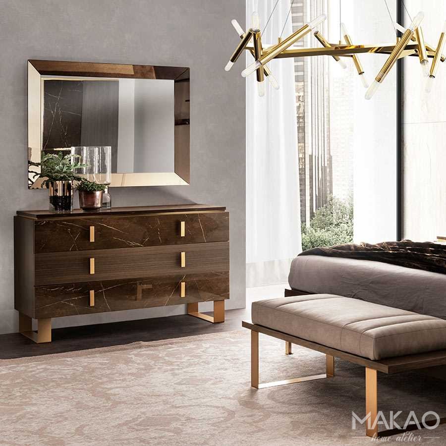 Komoda Essentiale to triumf detali i linii w doskonałej harmonii, w pełni wyrażający ducha i elegancję nowoczesnego stylu. Złocone refleksy uchwytów nawiązują do złoconych elementów wykończenia i jednocześnie podkreślają pionowe i smukłe wzornictwo brył z kolekcji.