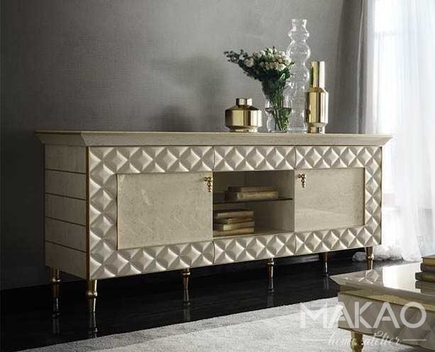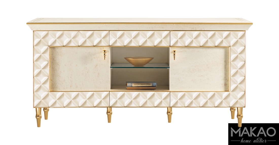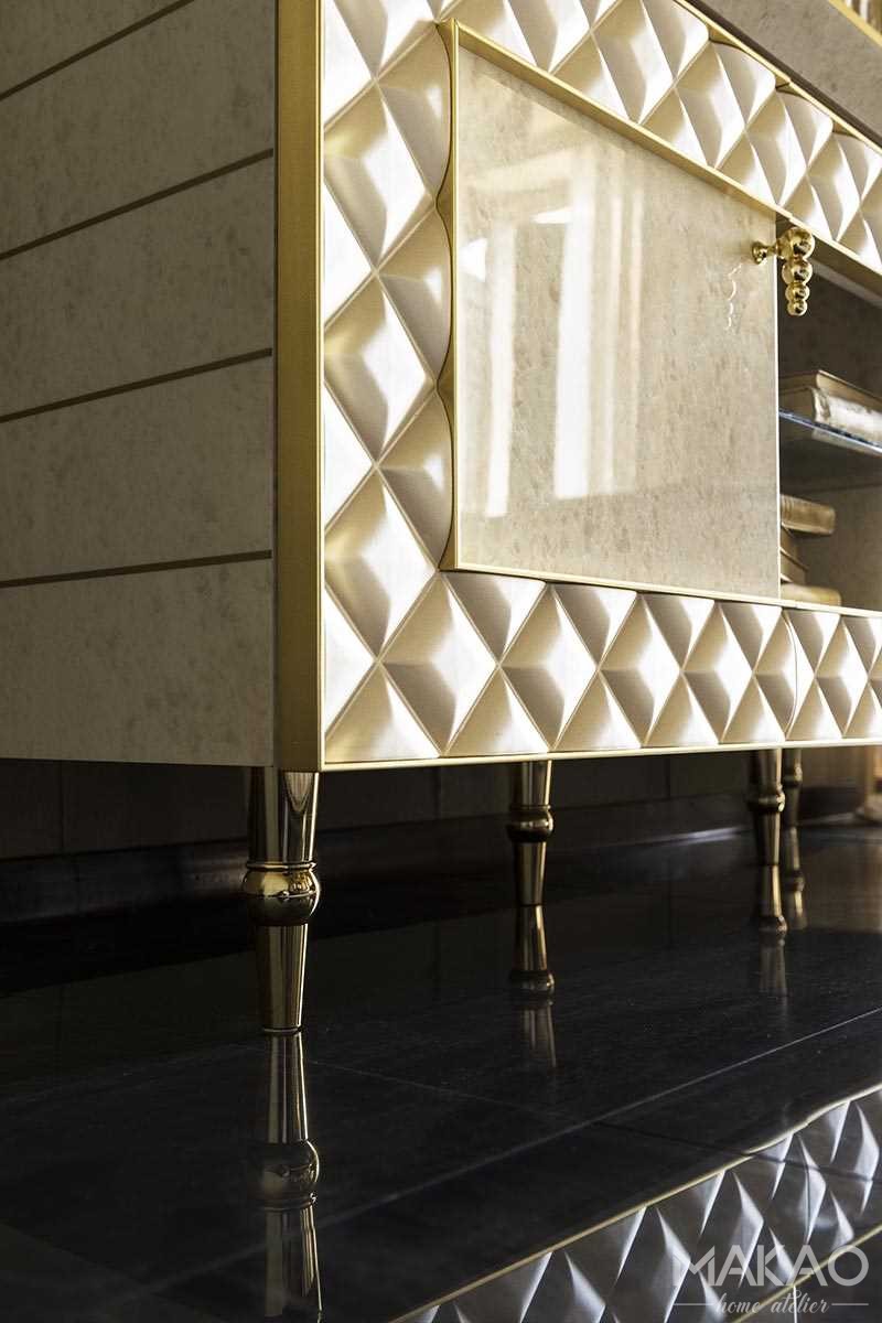 Komoda RTV Fabbri charakteryzuje się geometrią poziomą, w zestawieniu z dwoma witrynami pojedynczymi Fabbri, tworzy idealne miejsce na umieszczenie telewizora. Szeroka i świetlista ramka z wykończeniem rombowym podkreśla jedność i spójność kolekcji. Komoda RTV Fabbri niezależnie od tego, czy jest używana jako pojedynczy element, czy w połączeniu z witrynami, jest eleganckim dodatkiem wyrafinowanej geometrii.