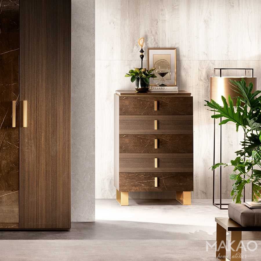 Każdy detal z kolekcji Essentiale został zaprojektowany tak, aby spełniał specyficzne wymagania funkcjonalne. W tym celu została również zaprojektowana komoda z siedmioma szufladami, oferująca ten sam wkład dekoracyjny co szafki nocne, zapewniając większą pojemność i miejsce na przechowywanie Twoich rzeczy.