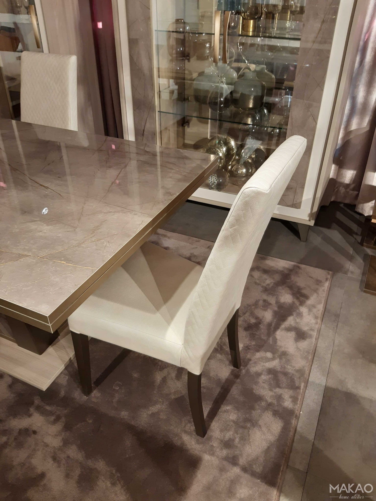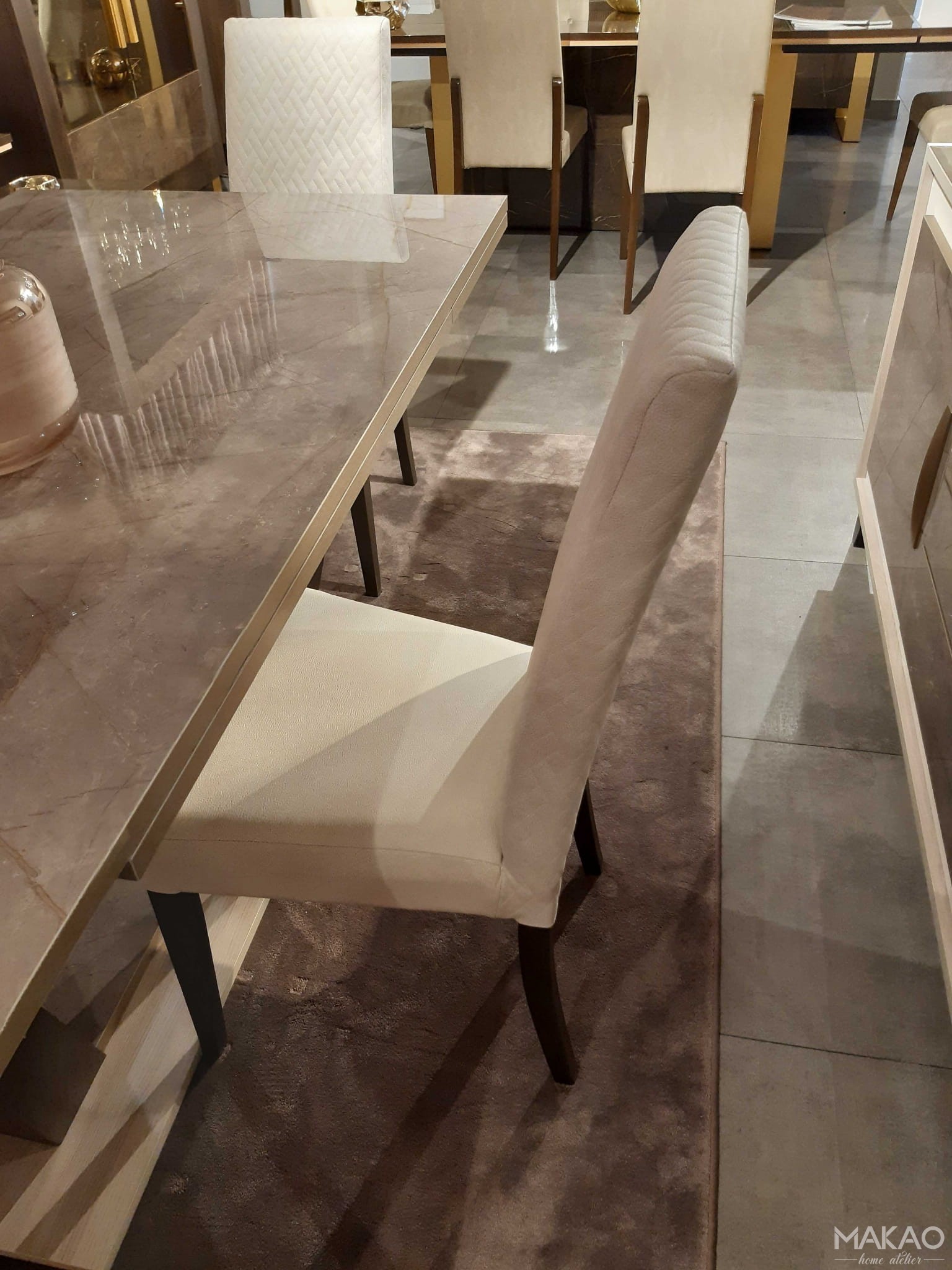 Krzesła Gabrielle odgrywają również kluczową rolę w jadalni. Mają minimalistyczny, ale solidny liniowy design. Lekko rozkloszowane nogi łączą się z oparciem w miękką krzywiznę, nadając siedzisku wygodny i przyjemny wygląd.