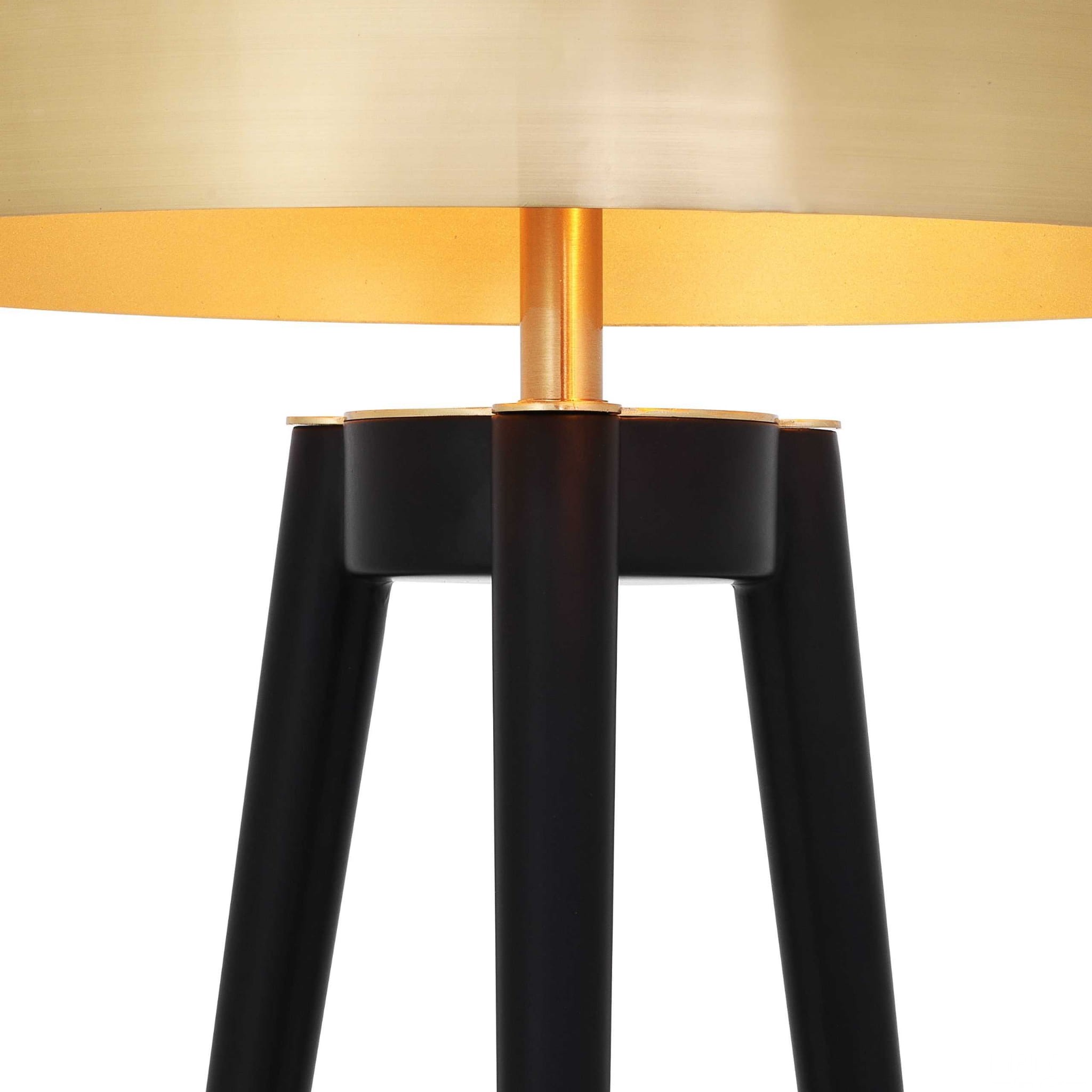 Dodaj przytulną atmosferę w stylu Mid-Century Modern do każdego pomieszczenia dzięki lampie podłogowej Coyote. Ta współczesna lampa podłogowa na trójnogu, ze złotym kloszem w kształcie kopuły i czarnymi, zwężającymi się nogami ze złotymi mosiężnymi nasadkami, nada Twojemu wnętrzu stylowy wygląd.