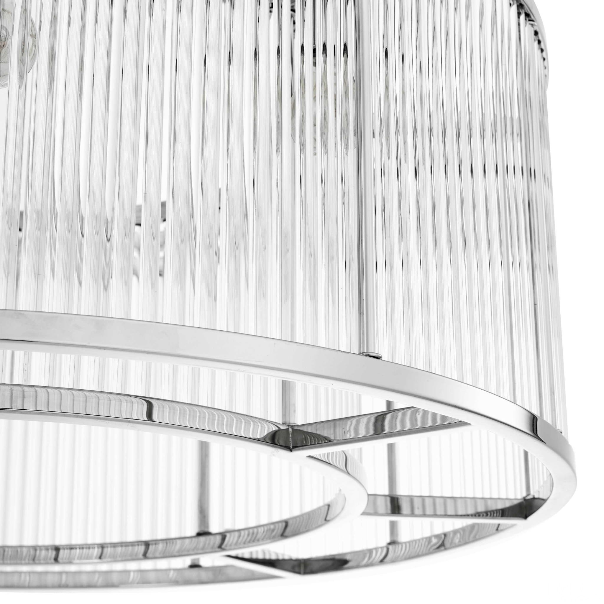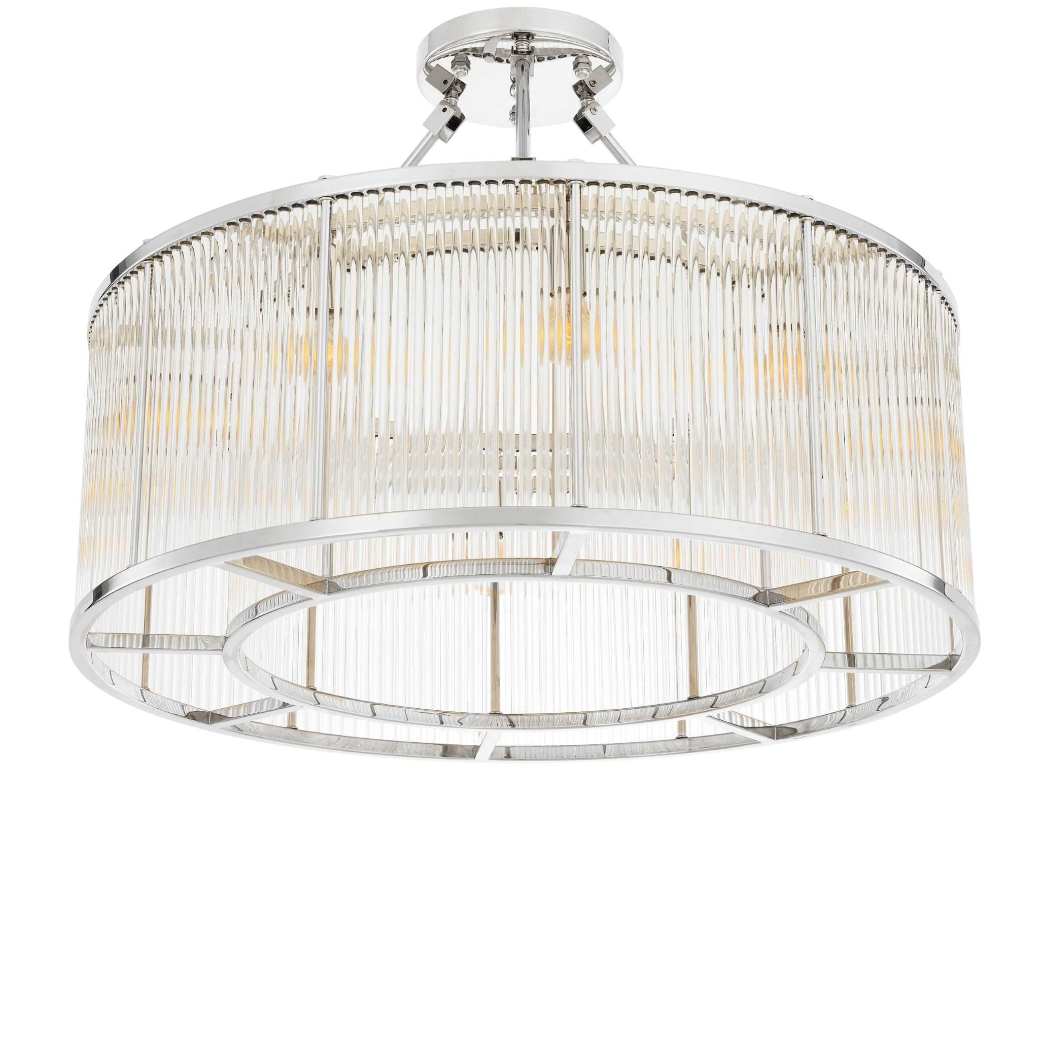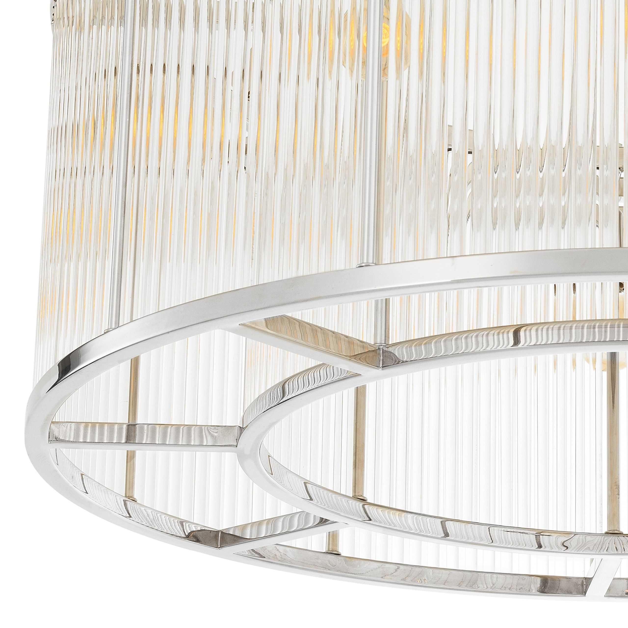 Ten fascynujący żyrandol Bernardi, inspirowany stylem art deco, inspirowany stylem z lat 20-tych, ożywi każdą przestrzeń w błyszczący sposób. Dzięki dwóm wznoszącym się poziomom lśniących szklanych kloszy, każdy klosz jest otoczony okuciami z niklu w kształcie bębnów, co zapewnia elegancki kontrast.