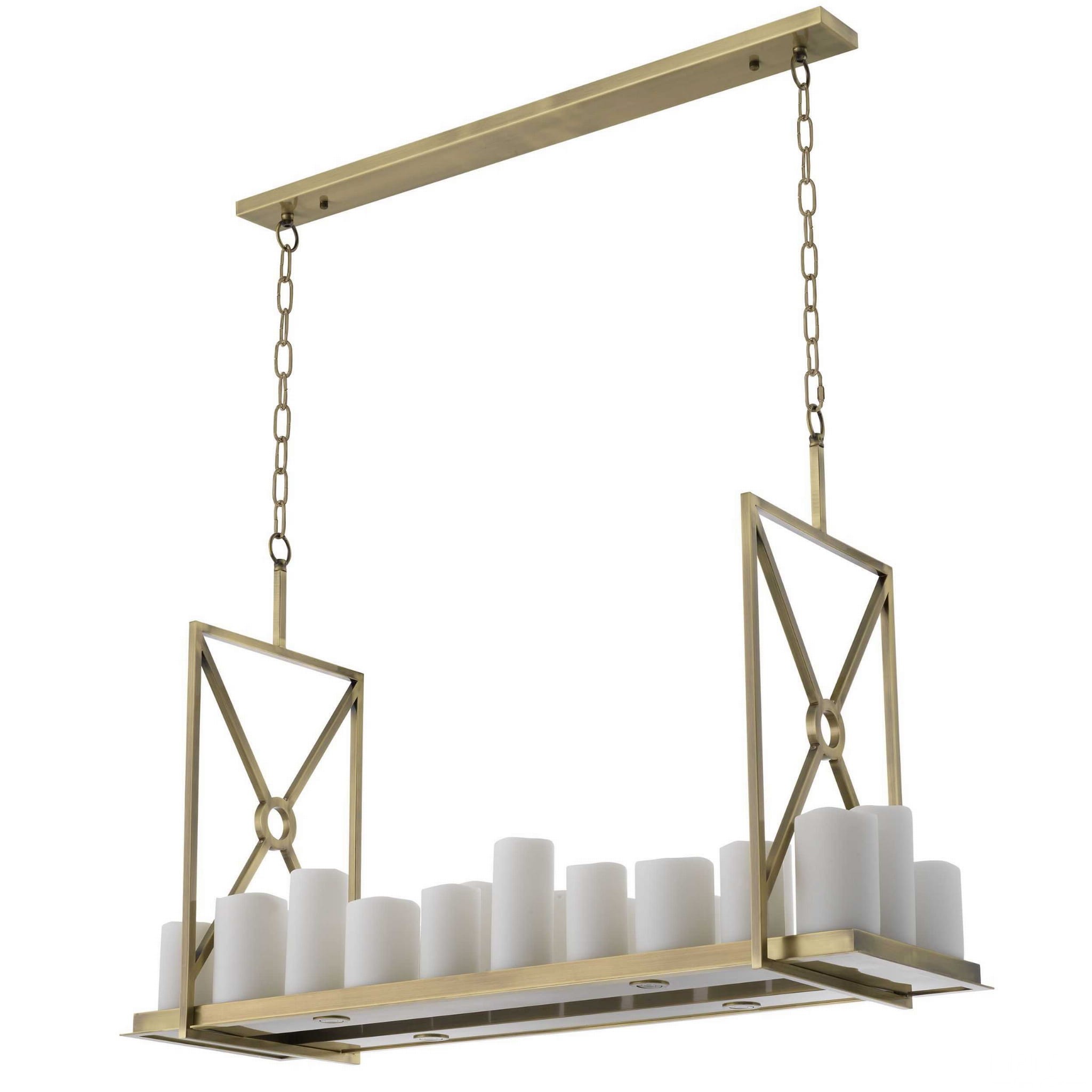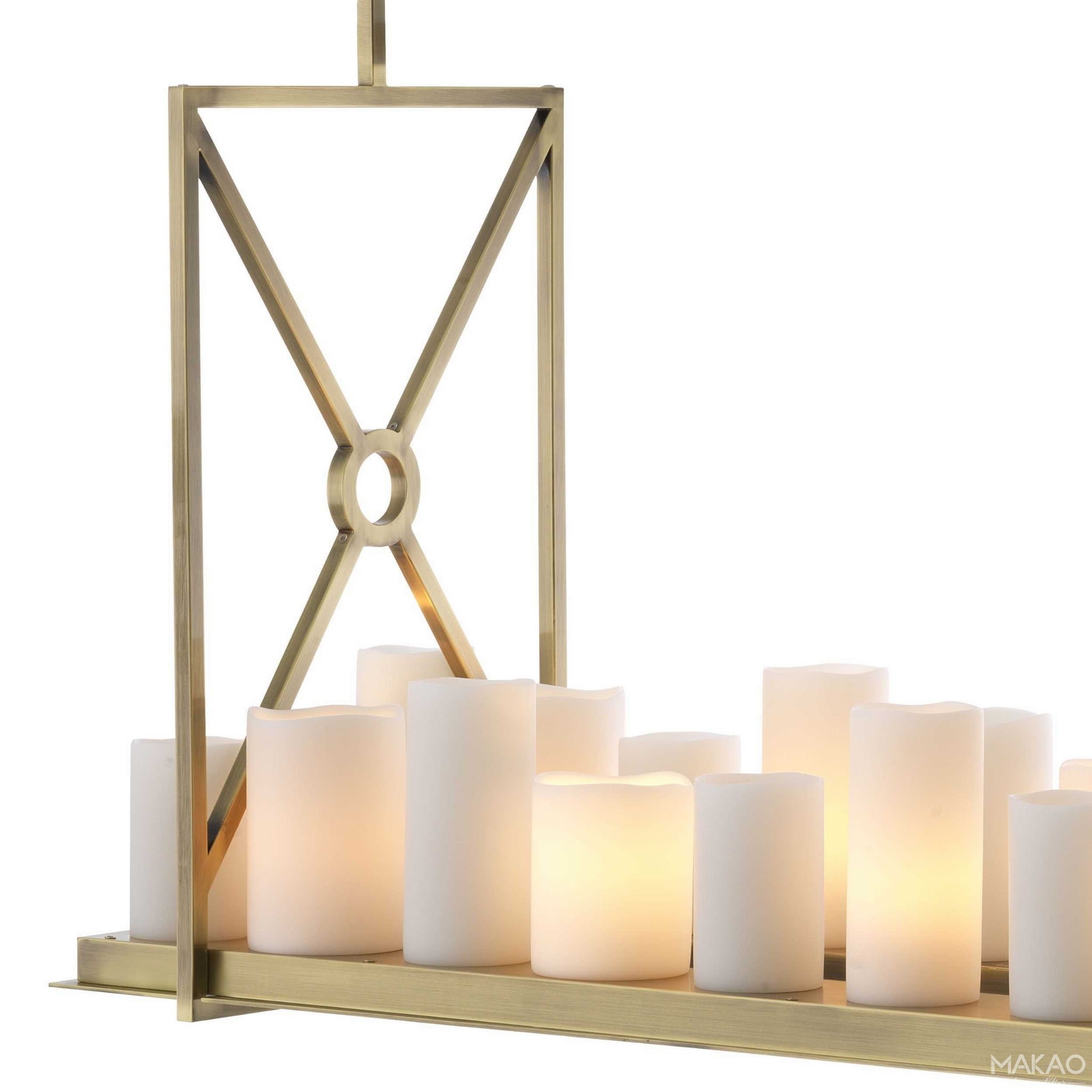 Rama z lekkiego szczotkowanego mosiądzu wykończona żyrandolem Commodore jest podtrzymywana przez mocny daszek sufitowy z ogniwami łańcuchowymi. Posiada prostokątną tabliczkę z 22 stożkowymi, sztucznymi świecami kolumnowymi, które imitują naturalnie topiący się wosk jak w prawdziwych świecach tego formatu. W dolnej części płyty znajdują się 4 wbudowane oprawy typu downlight LED. Światła w tym żyrandolu można włączać i wyłączać za pomocą dołączonego pilota. Możliwych jest kilka różnych ustawień. Uwaga: tego żyrandola nie można ściemniać i nie można go używać ze ściemniaczem.