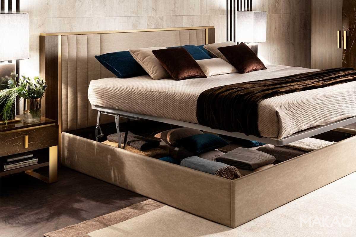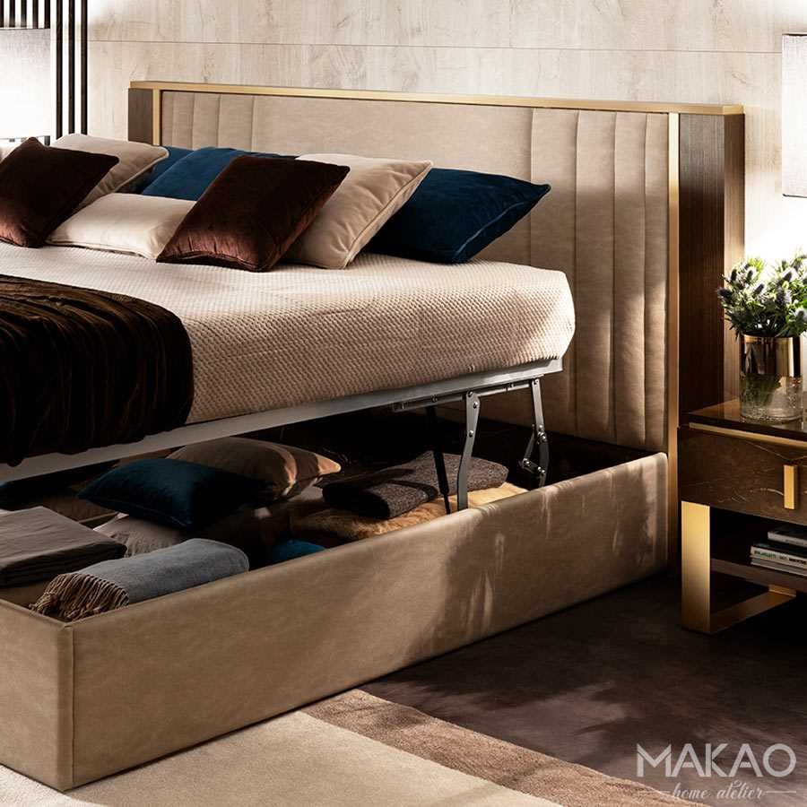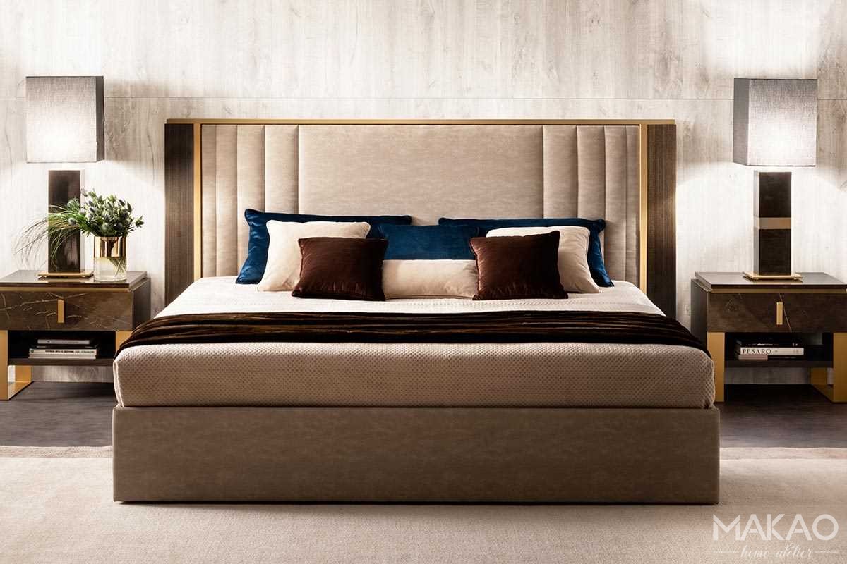Łóżka włoskie Essentiale Tessuto to prawdziwa świątynia, w której odpoczynek staje się ekskluzywnym przeżyciem. Szerokie i wygodne, wyposażone są w tapicerowany zagłówek z widocznym pikowaniem podążającym za pionowością złoconej listwy w linearnym i eleganckim efekcie estetycznym.