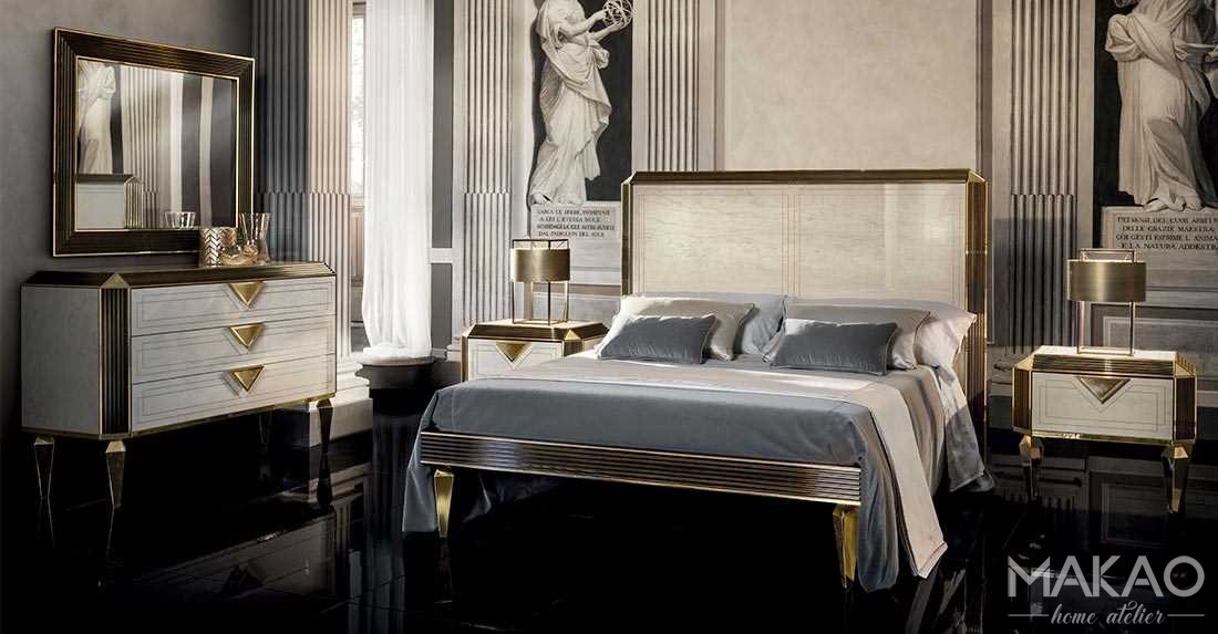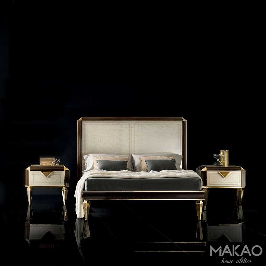 Metalowe nóżki w kolorze złotym dodają lekkiego akcentu, który przyjemnie wspiera solidną konstrukcję łóżka. Jasny zagłówek jest pięknie osadzony w drewniano-złotej ramie, która wyraża pełnię stylu – podstawę kolekcji Bellezza.
