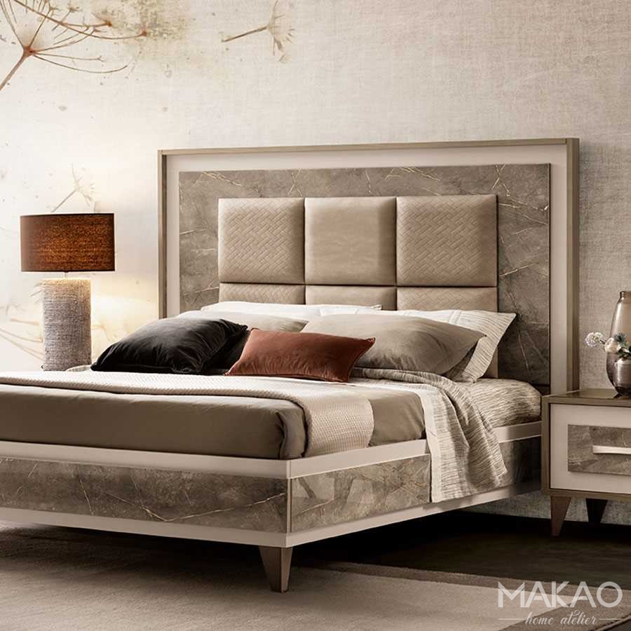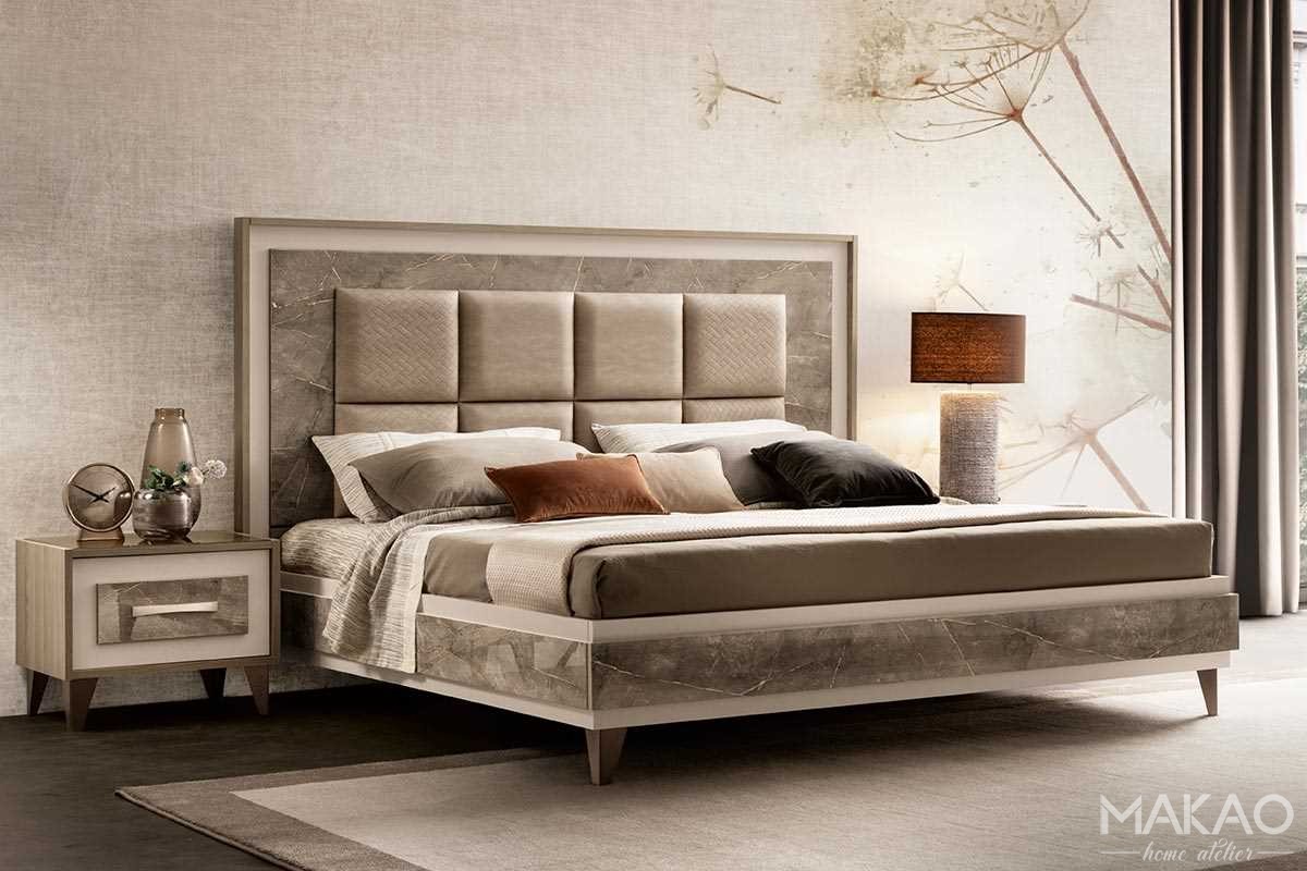 Tapicerowane łóżko Gabrielle TESSUTO to prawdziwy klasyk. Kwadratowa tapicerka na środku wezgłowia przypomina capitonné typowe dla stylu klasycznego, a marmurowe wykończenie podkreśla charakter kolekcji Gabrielle.