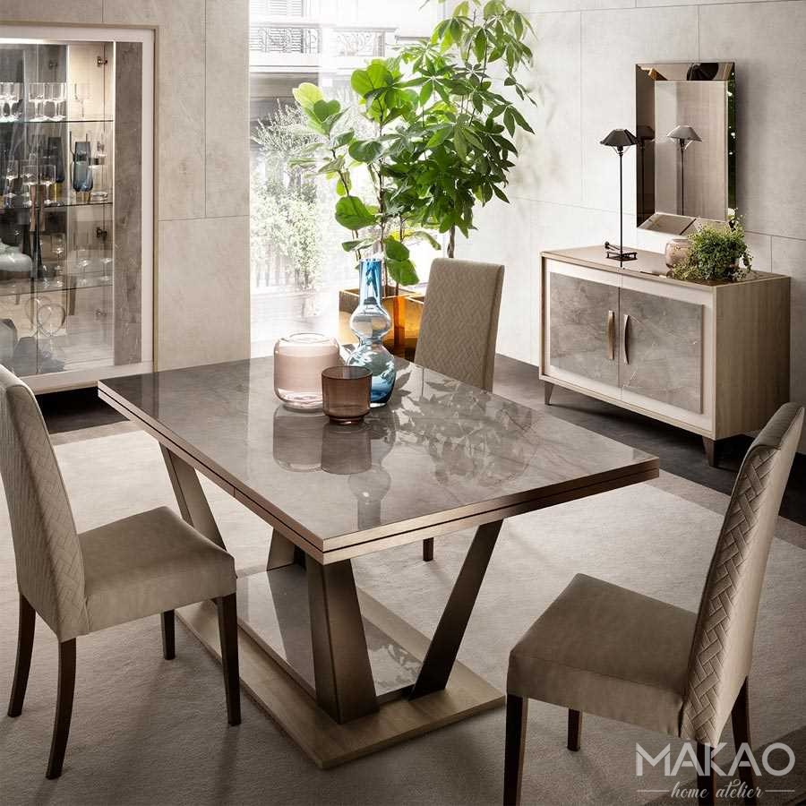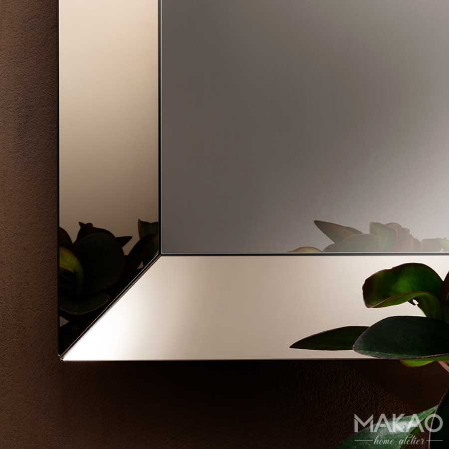 Lustra uzupełniają kompozycję i gustownie komponują się z zabudową bufetową. W rzeczywistości połysk lakierowanego szklanego blatu bufetu dobrze łączy się z brązowymi refleksami lustra ściętego pod kątem 45 stopni. Ten szczególny projekt podkreśla odbicia ramy w lustrzanym szkle i brązowym wykończeniu, tworząc fascynującą grę odcieni i głębi.