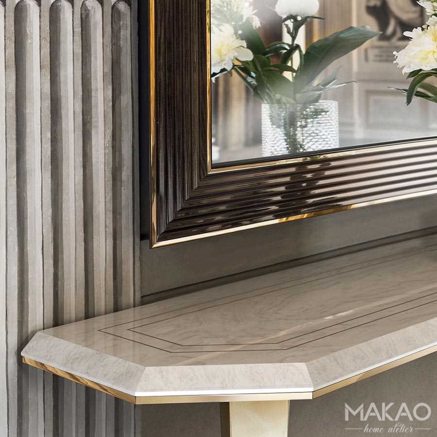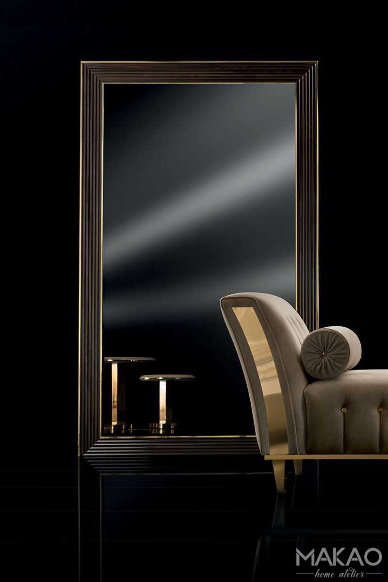 Nic tak nie uchwyci światła jak lustro. Lustro osadzone jak kamień szlachetny, w ramie wykończonej wiązem ze złotymi profilami, majestatycznie podkreśla charakter kolekcji Bellezza.