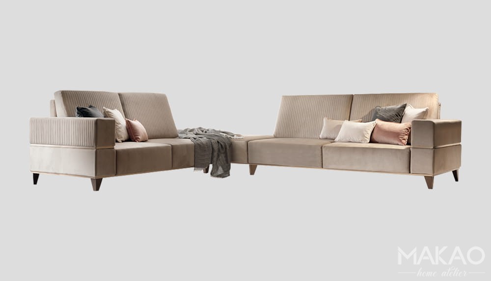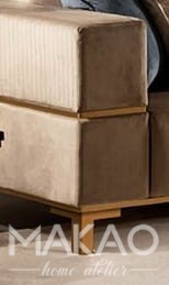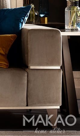 Przytulne siedziska, szerokie oparcia i podłokietniki z pionowym pikowaniem. To cecha charakterystyczna foteli do salonu Gabrielle No 2. W rzeczywistości każdy element ma ostry i mocny kształt, czyste i liniowe formy ozdobione cennymi pozłacanymi wstawkami, które otaczają podłokietniki i podstawę. Modułowe sofy, wygodne fotele i wygodne pufy, które dają możliwość przyjemnego relaksu bez utraty stylu.