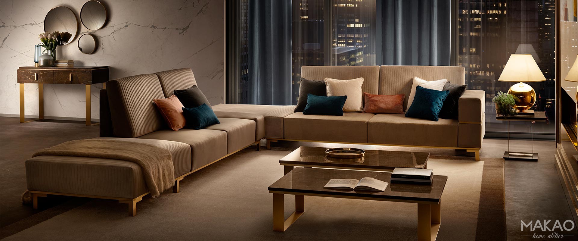 Przytulne siedziska, szerokie oparcia i podłokietniki z pionowym pikowaniem. To cecha charakterystyczna foteli do salonu Gabrielle No 2. W rzeczywistości każdy element ma ostry i mocny kształt, czyste i liniowe formy ozdobione cennymi pozłacanymi wstawkami, które otaczają podłokietniki i podstawę. Modułowe sofy, wygodne fotele i wygodne pufy, które dają możliwość przyjemnego relaksu bez utraty stylu.