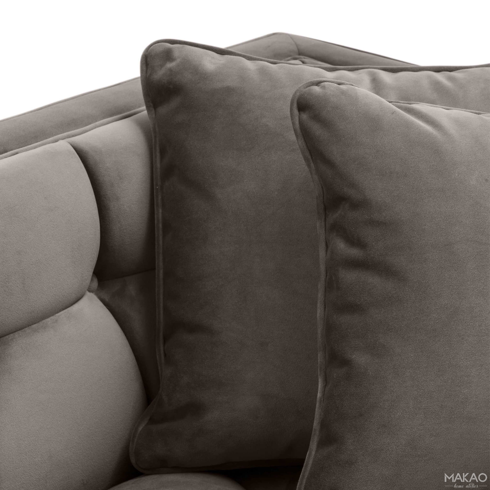 Wspaniała sofa Sienna łączy wygodę i styl. Oparcie w kształcie litery T tworzy całość z podłokietnikami. Ten elegancki, nowoczesny fotel jest pokryty tuftowaną tapicerką z aksamitnego szarego aksamitu Savona, z czterema kwadratowymi poduszkami. Nogi wykończone w kolorze złotym dodają jej luksusowego wyglądu.