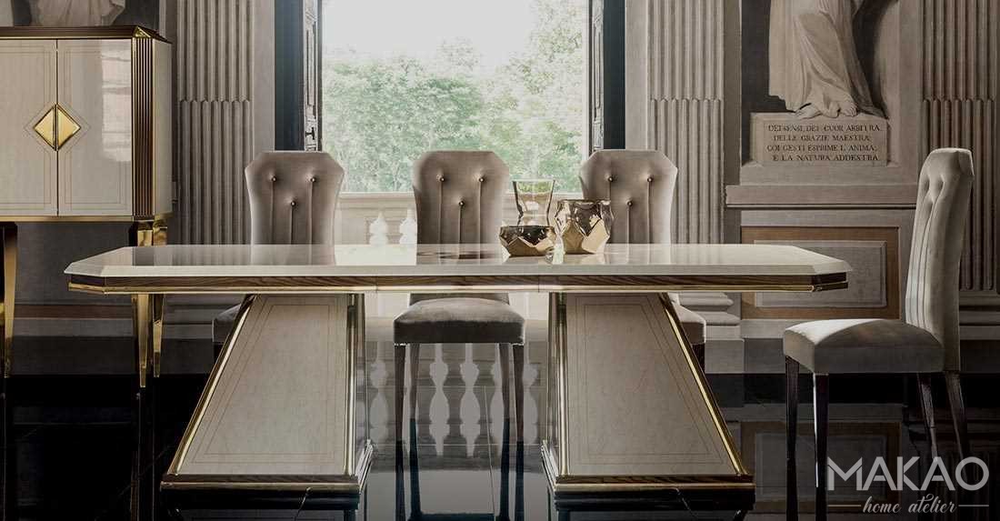 Najbardziej elegancką częścią stołu z kolekcji Bellezza jest bez wątpienia ścięcie rogów blatu. Blat zaginany na końcach w cztery trójkąty, motyw przewodni całej kolekcji, nawiązujący do typowego kształtu oszlifowanych diamentów.