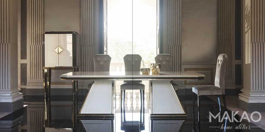 Najbardziej elegancką częścią stołu z kolekcji Bellezza jest bez wątpienia ścięcie rogów blatu. Blat zaginany na końcach w cztery trójkąty, motyw przewodni całej kolekcji, nawiązujący do typowego kształtu oszlifowanych diamentów.