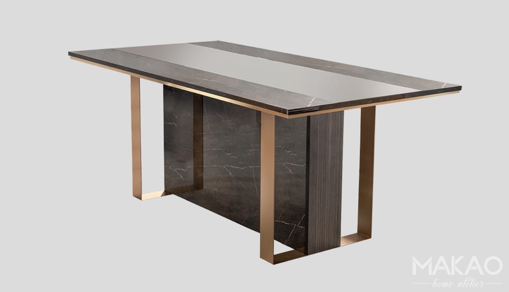 Stoły Essentiale są lekkie w odbiorze i konsekwentnie podkreślają cechy kolekcji. Stoły są imponujące i wyrafinowane dzięki kontrastującym wykończeniom i wyjątkowości złoconych detali. Całość zdobień która je otacza, wzmacnia geometrię i styl kolekcji Essentiale.