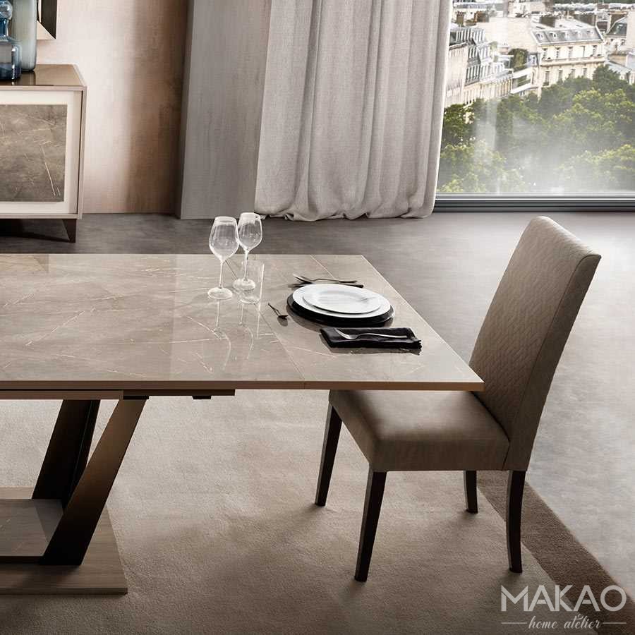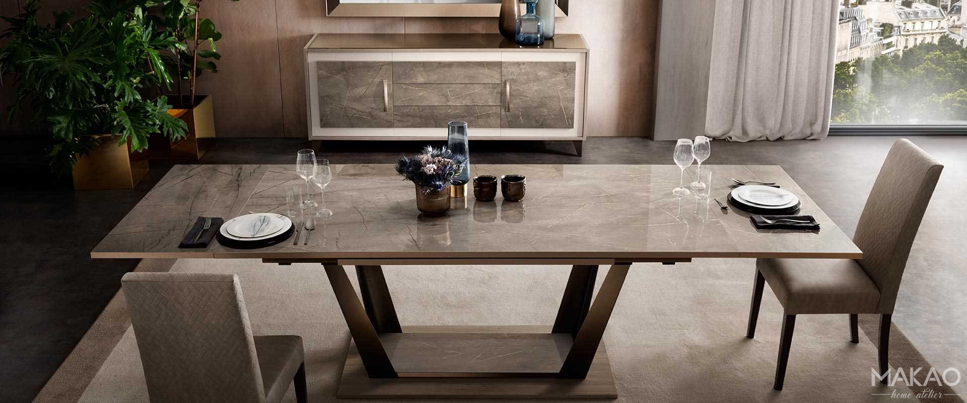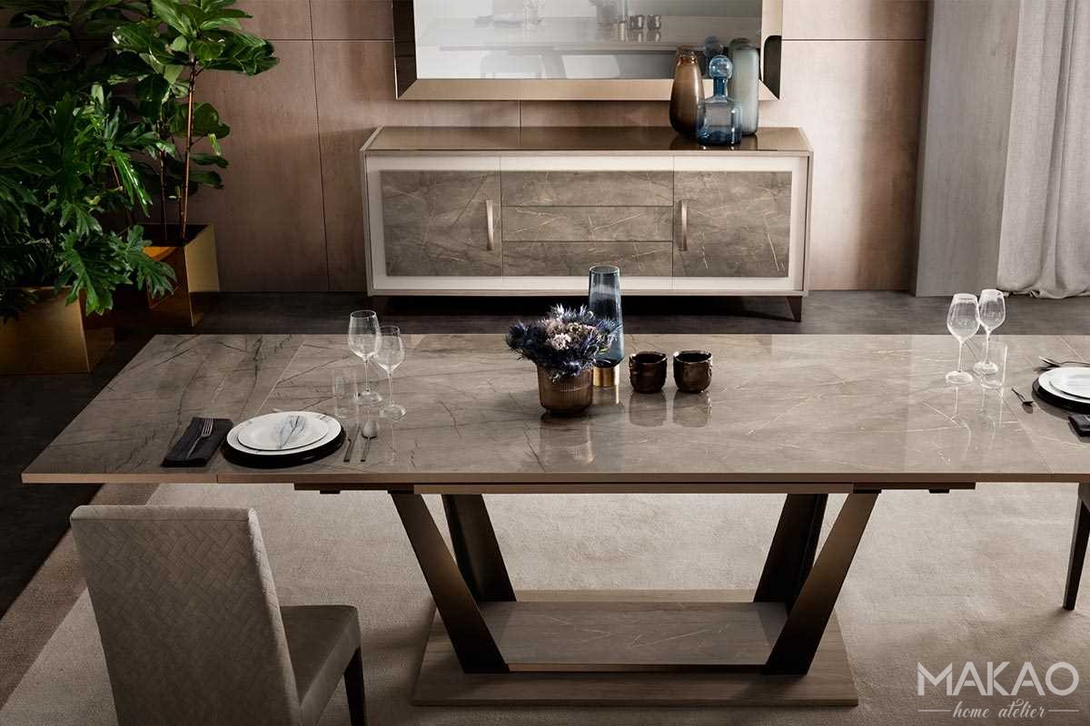 Stoły do jadalni Gabrielle charakteryzują się unikalnymi kształtami i ponadczasowymi formami. Cechą wyróżniającą jest podstawa oraz wykończenie blatu. Błyszczący efekt blatu – dostępny również w lakierowanym szkle – jest tu jeszcze bardziej widoczny i dobrze łączy się z fakturą na przednich drzwiach szafki bufetowej, tworząc poczucie konsekwencji stylistycznej i równowagi.