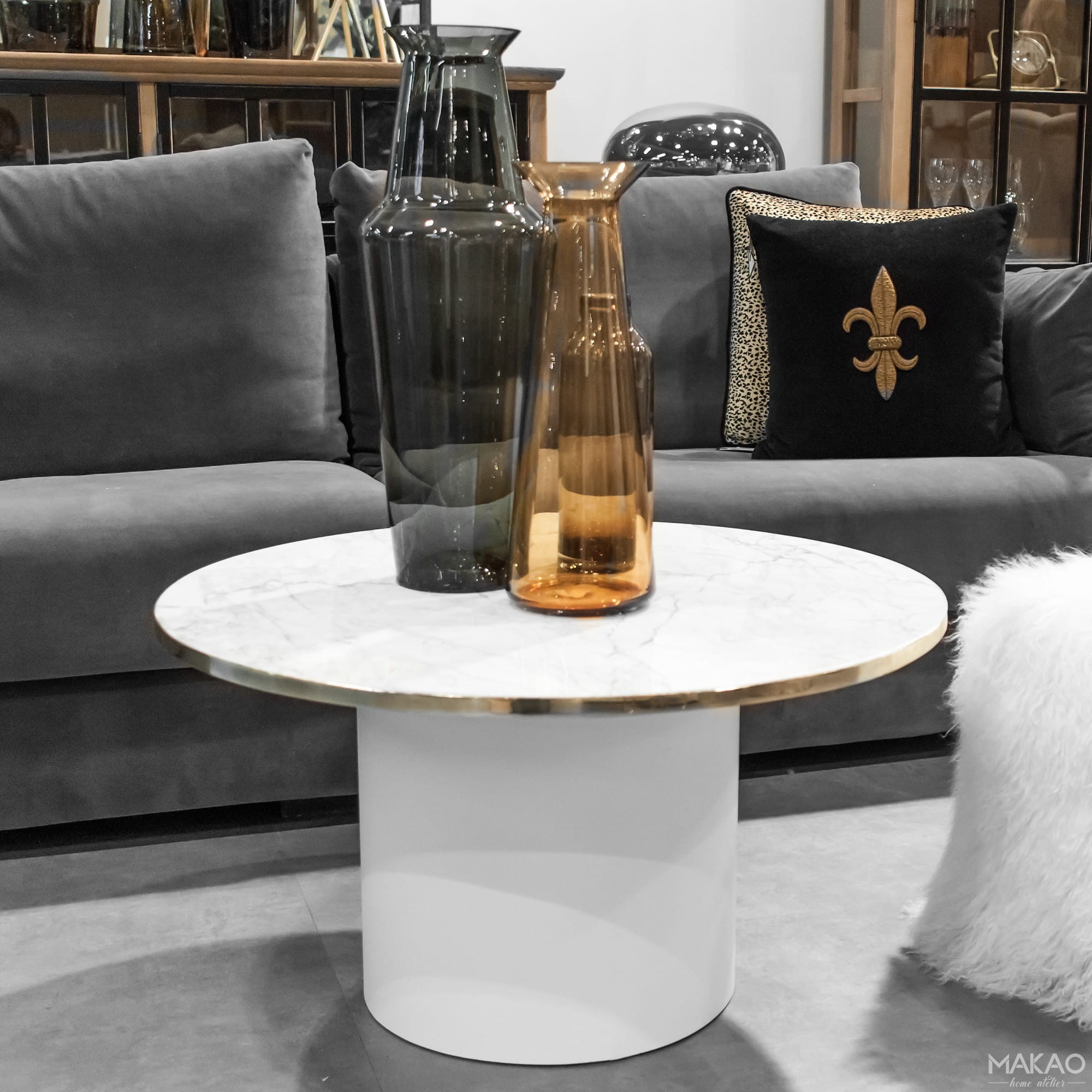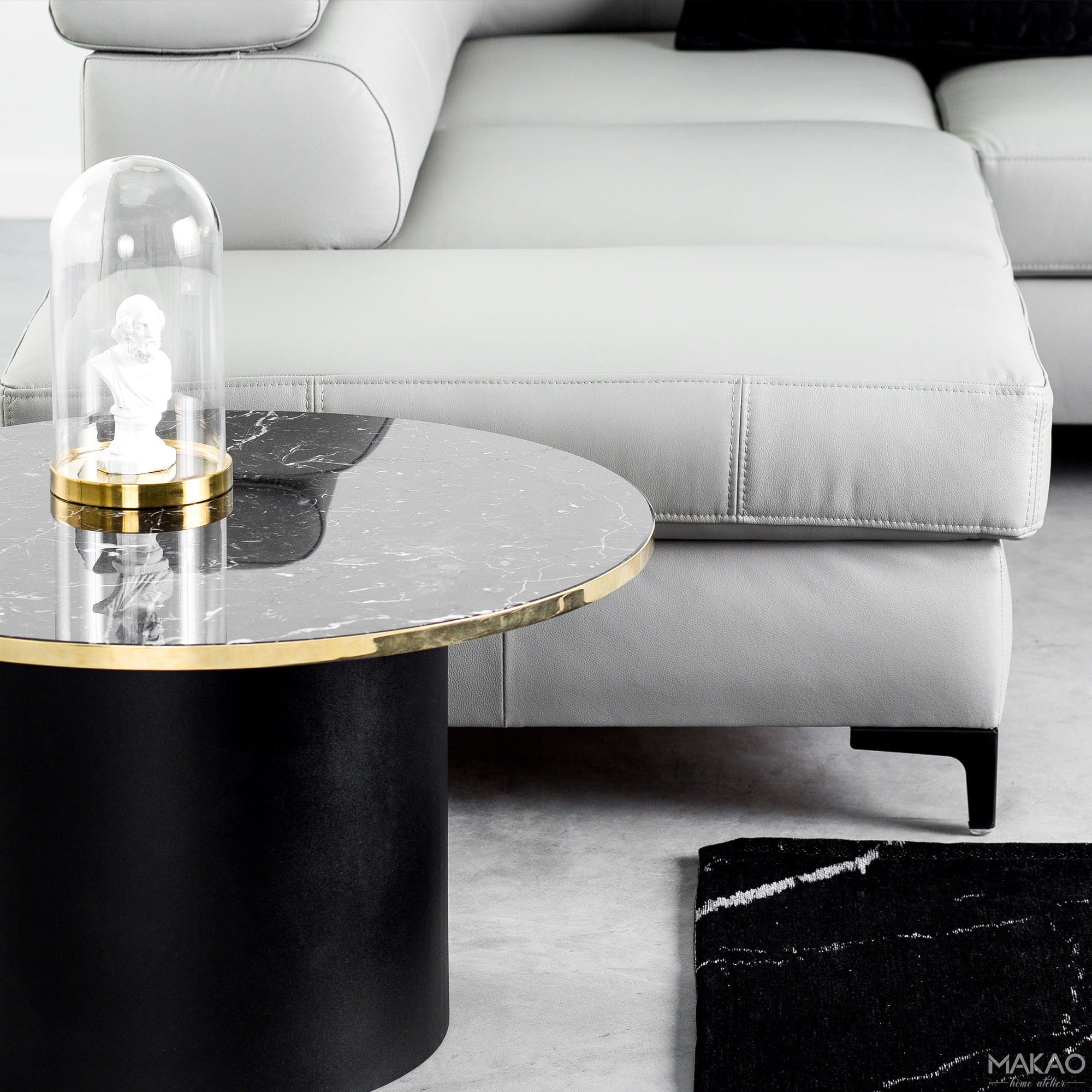 Stolik kawowy Sensual No 8 z marmurowym blatem, wykończony mosiężną blendą. Blat wykonany z marmuru o grubości 2 cm do wyboru marmur biały Carrara lub czarny Marquina nero. Podstawa dostępna w dwóch kolorach: biała lub czarna. Dostępne rozmiary: ø 80 cm lub ø 90 cm.