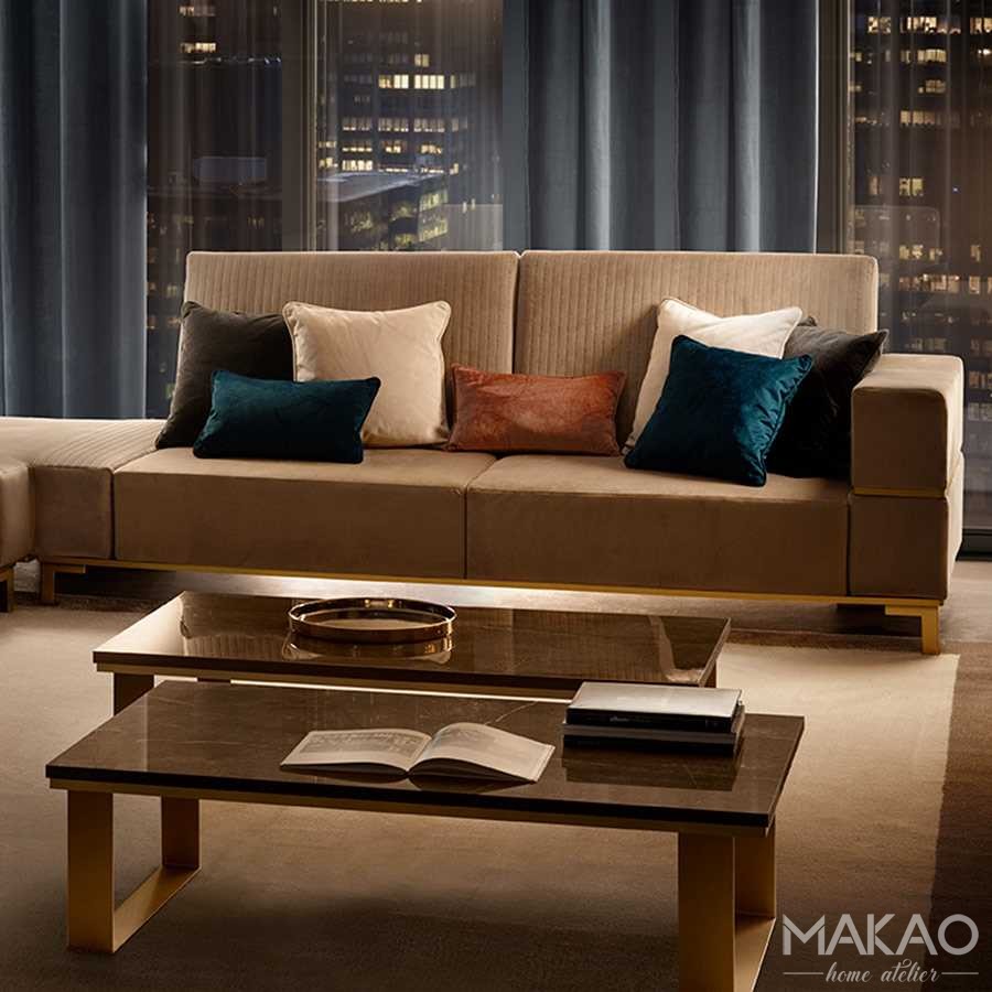 Podobnie jak pozostałe elementy kolekcji Essentiale, stoliki kawowe charakteryzują się wyjątkowymi pozłacanymi listwami wykończeniowymi. Luksusowy detal idealnie pasuje do blatu dostępnego w wykończeniu szklanym lub marmurowym.