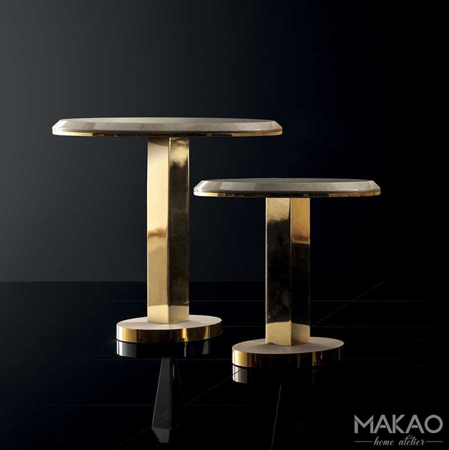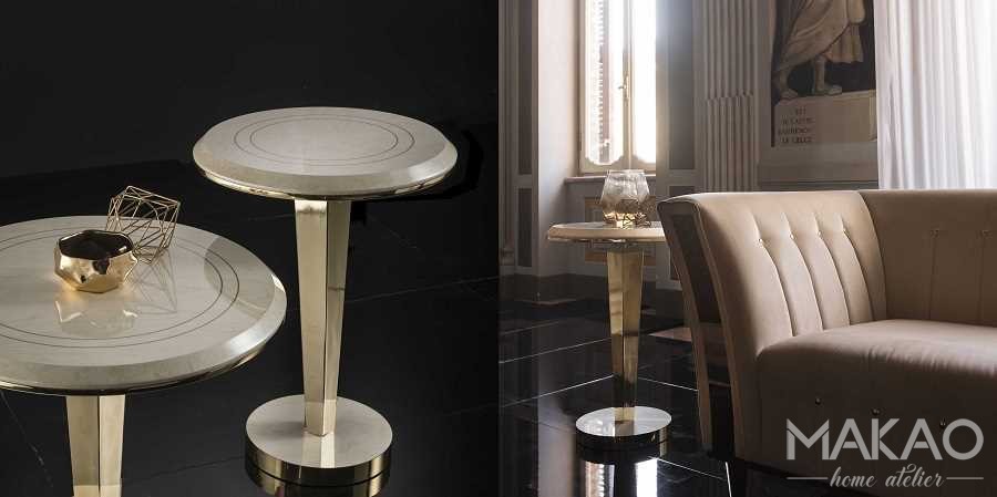 Geometryczne nacięcia na blacie nadają stolikom z kolekcji Bellezza szczególny styl. Potrójne warstwy materiałów i wykończeń, marmurowa kolorystyka blatu, drewno wiązu i złoto czynią stoliki z kolekcji Bellezza idealnym uzupełnieniem wnętrza.
