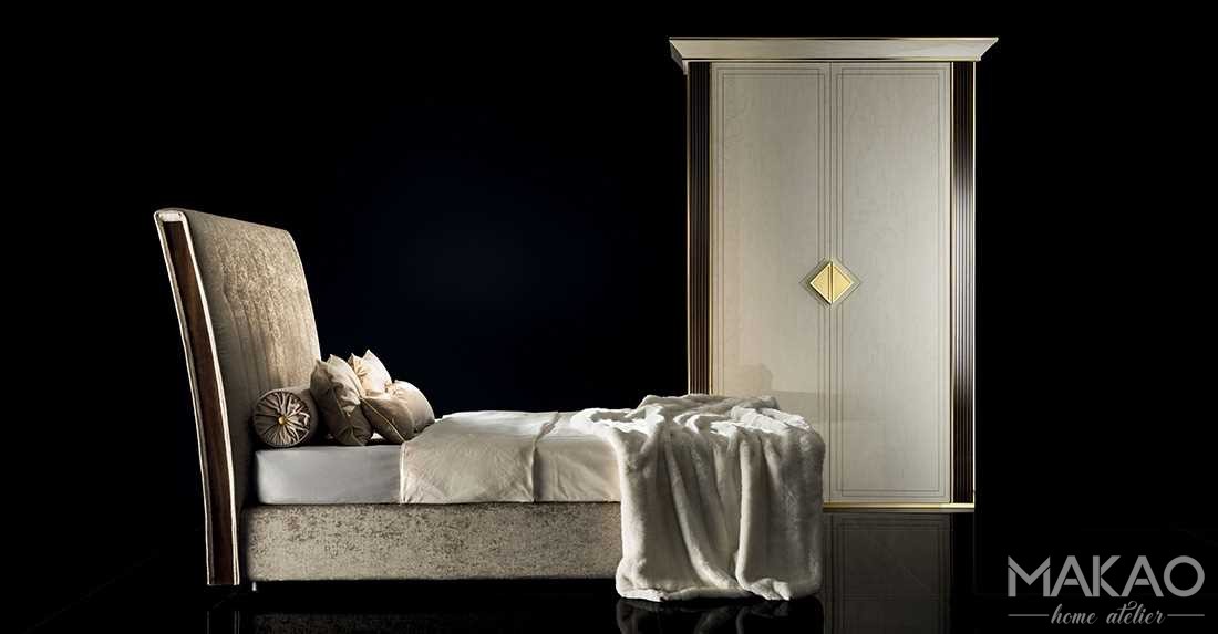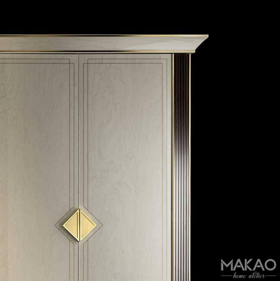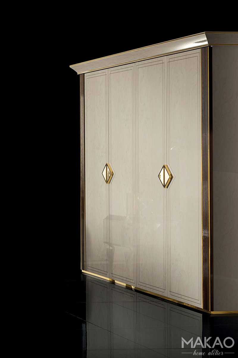 Szafy 2D czy 4D z kolekcji Bellezza charakteryzuje silne nawiązanie do stylu z początku XX wieku i podstawowych zasad projektowych. Duże powierzchnie wykończone w kolorze marmuru pięknie układają się w złotych listwach, a trójkątne uchwyty są znakiem rozpoznawczym kolekcji.
