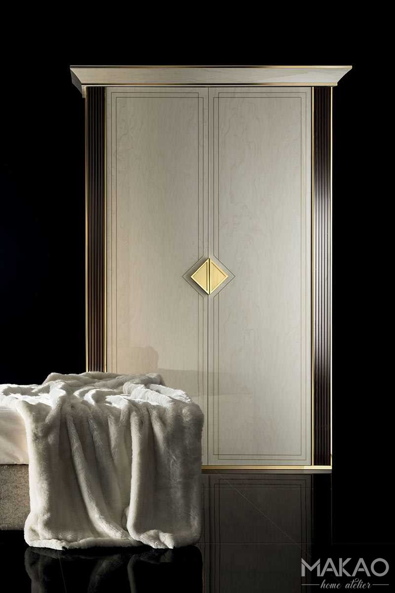 Szafy 2D czy 4D z kolekcji Bellezza charakteryzuje silne nawiązanie do stylu z początku XX wieku i podstawowych zasad projektowych. Duże powierzchnie wykończone w kolorze marmuru pięknie układają się w złotych listwach, a trójkątne uchwyty są znakiem rozpoznawczym kolekcji.