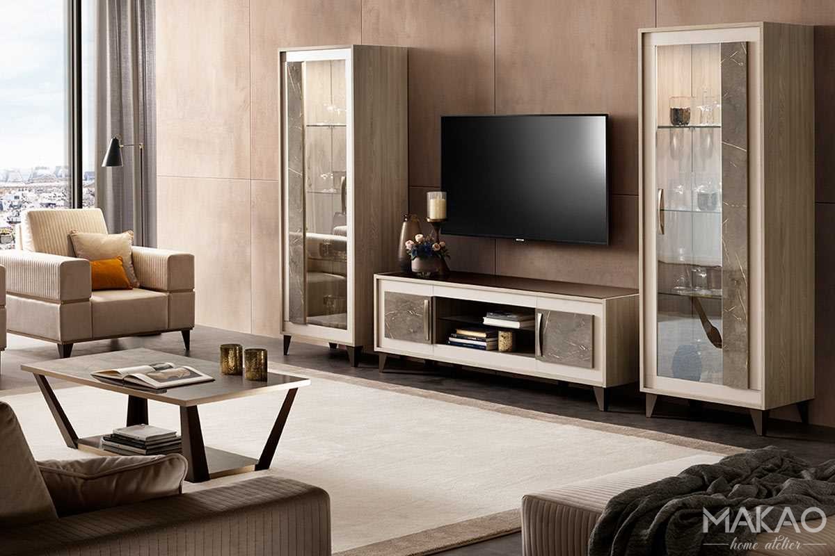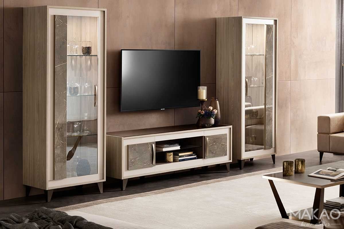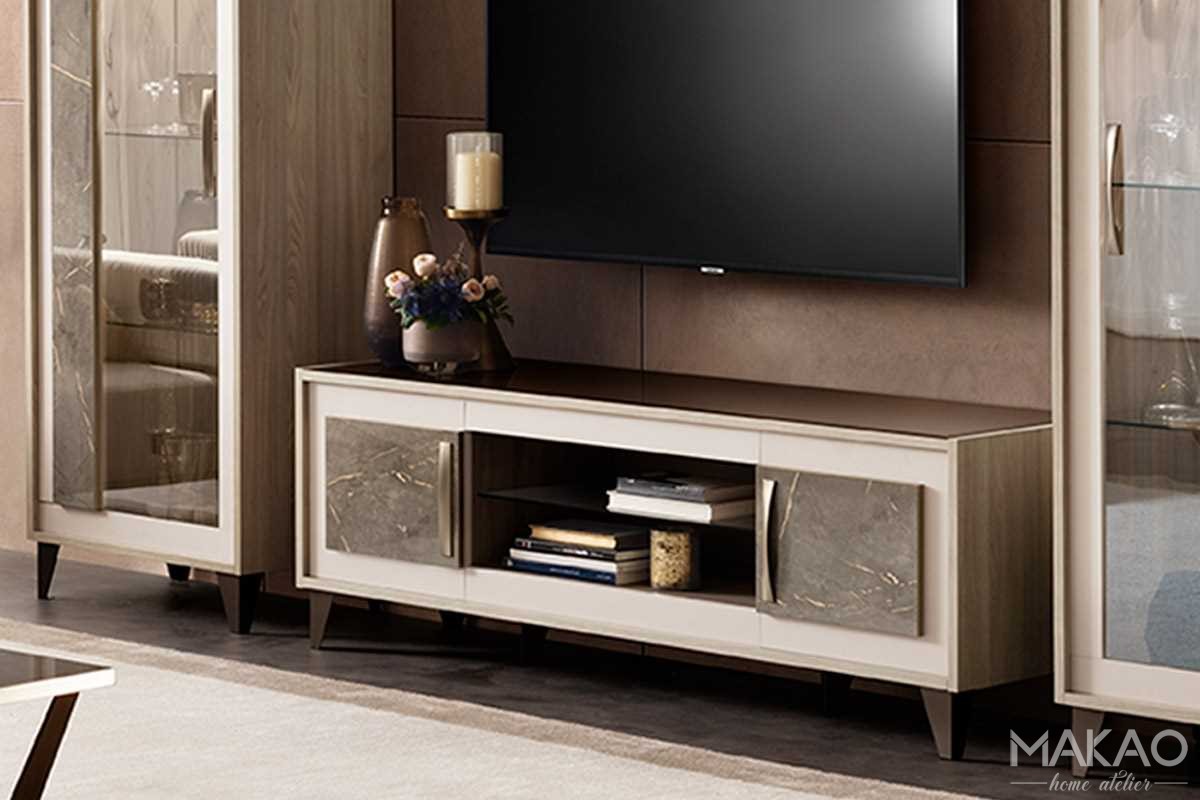 Szafka pod telewizor RTV została zaprojektowana tak, aby bryła dopełniała kolekcję Gabrielle. Wszystkie elementy wykończenia spójnie identyfikują kolekcję Gabrielle i wskazują na niepowtarzalne podwójne tekstury stworzone z wykończenia wiązu i satynowych uchwytów i nóżek z brązu. Połączenie, które nie pozostaje niezauważone i charakteryzuje całą kolekcję.