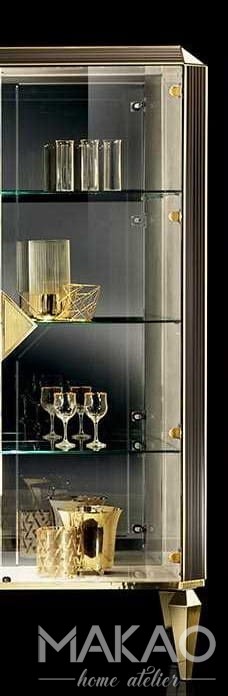 Szklane witryny Bellezza pozwalają na wydobycie światła. Szklany front osadzony jest w ramie z wykończeniem wiązu i jasnozłotym słojem. Dzięki temu rozwiązaniu witryna jest idealna do eksponowania i prezentowania zawartości.