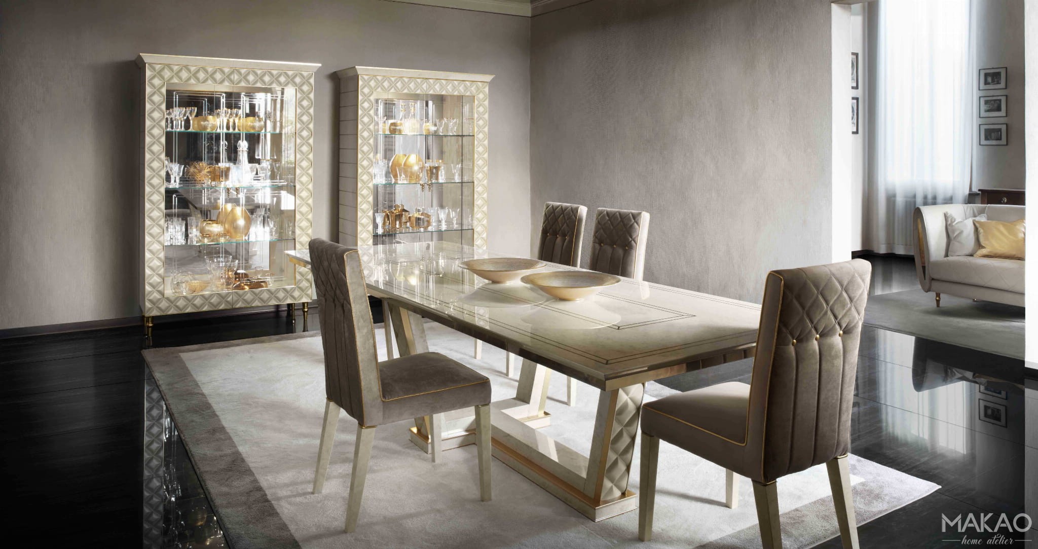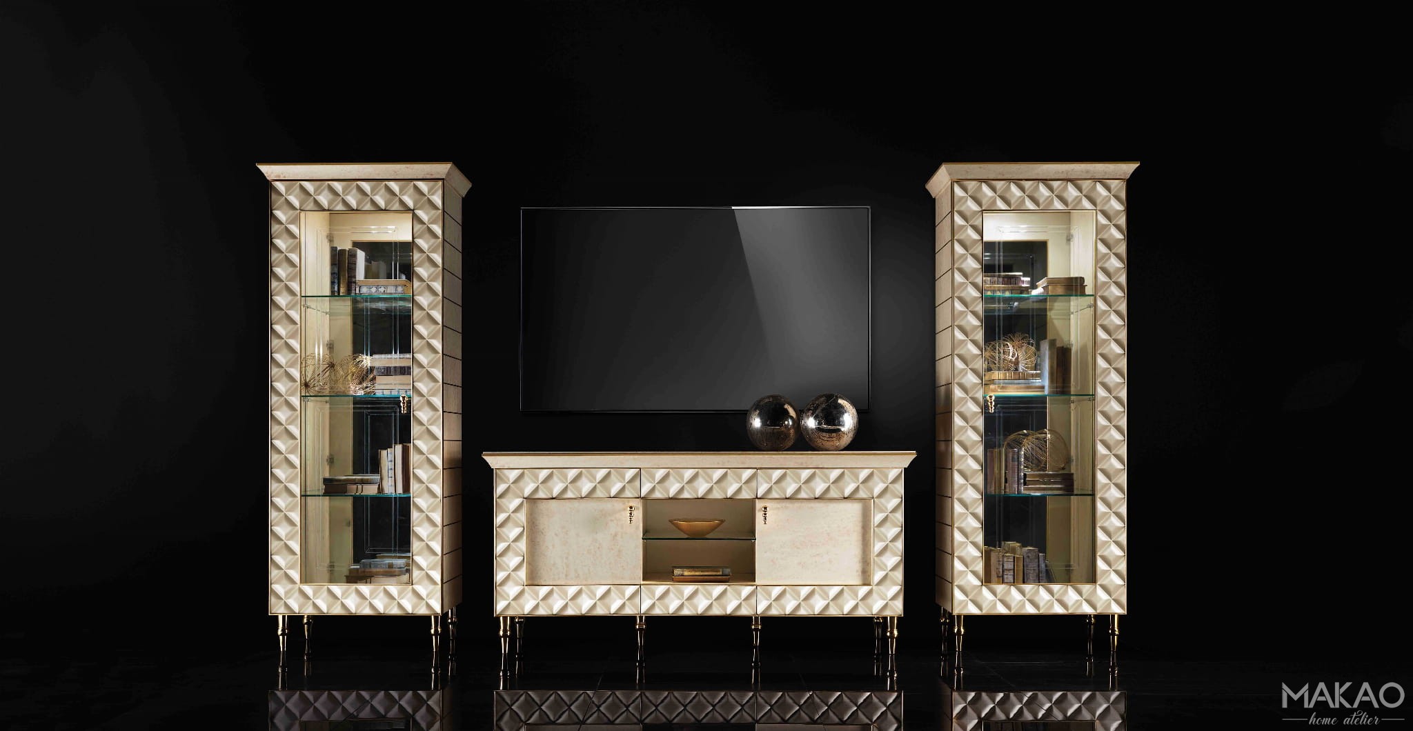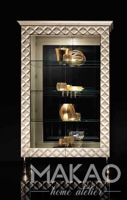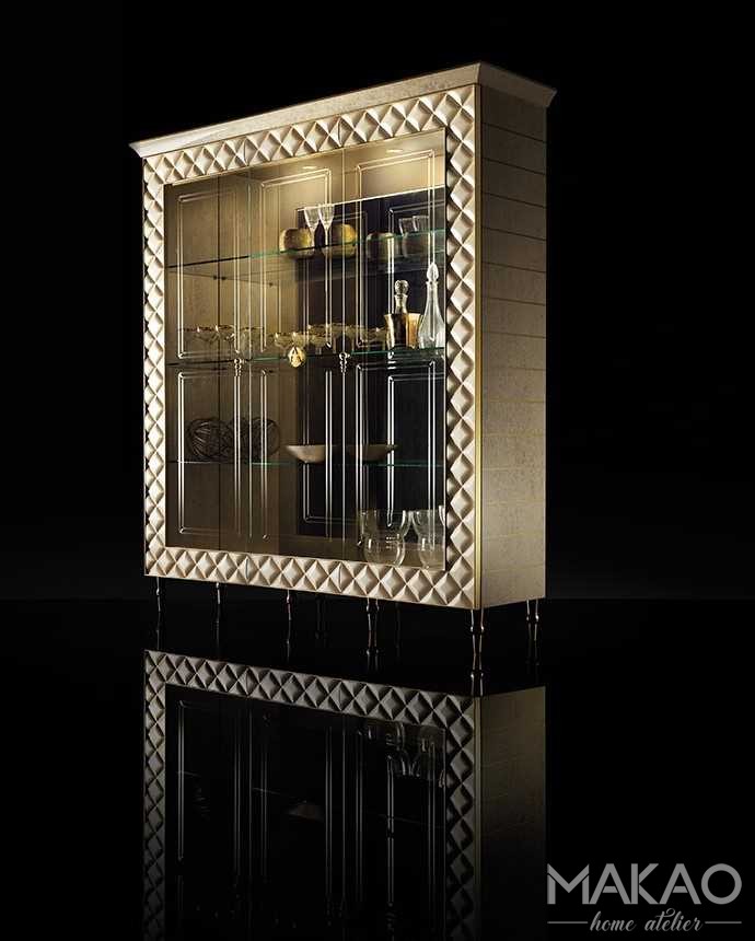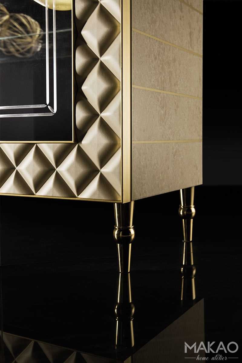 Witryny z kolekcji Fabbri to meble, które można łączyć w eklektyczne zestawienia lub samodzielnie wpisywać w otoczenie. Zestawione z innymi meblami tworzą nową przestrzeń. Bryły z kolekcji Fabbri cechuje minimalistyczna geometria, dostępna w różnych rozmiarach, wzbogacona delikatnymi dekoracyjnymi detalami z rombami na zewnętrznej ramie. Pozłacane nóżki podnoszą całą konstrukcję nadając kolekcji lekkość i charakter.